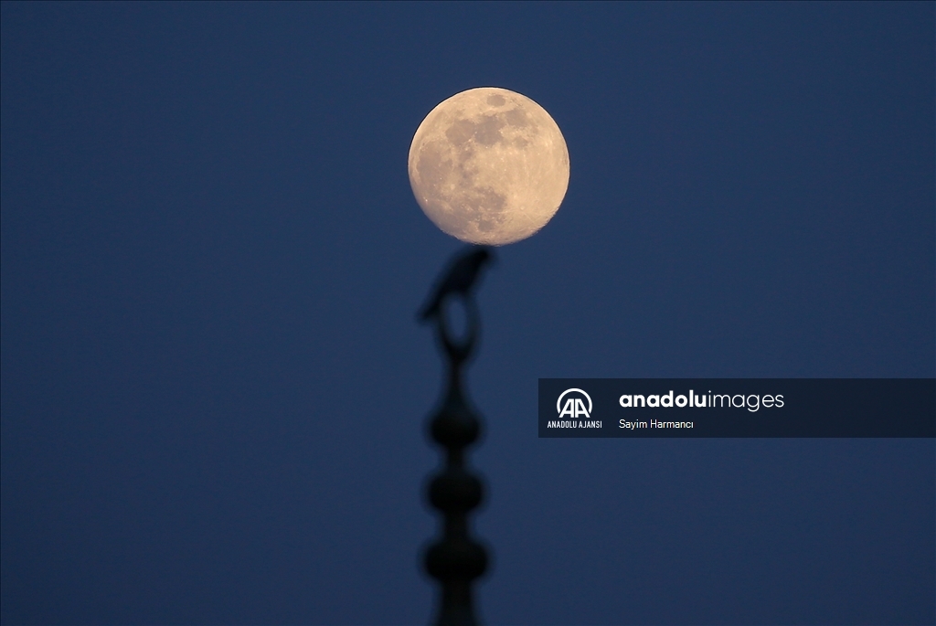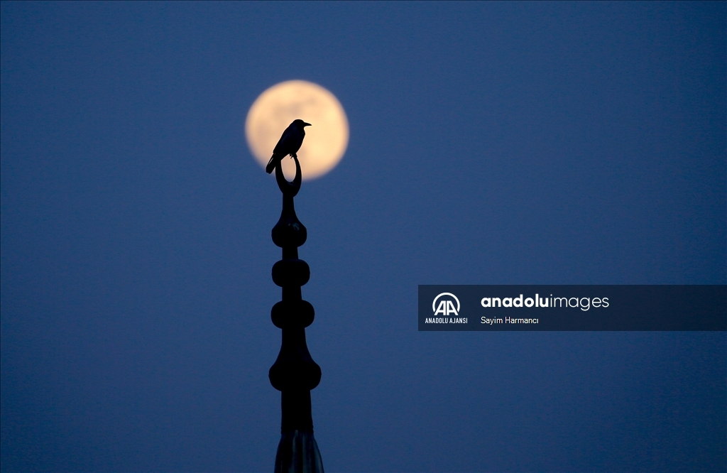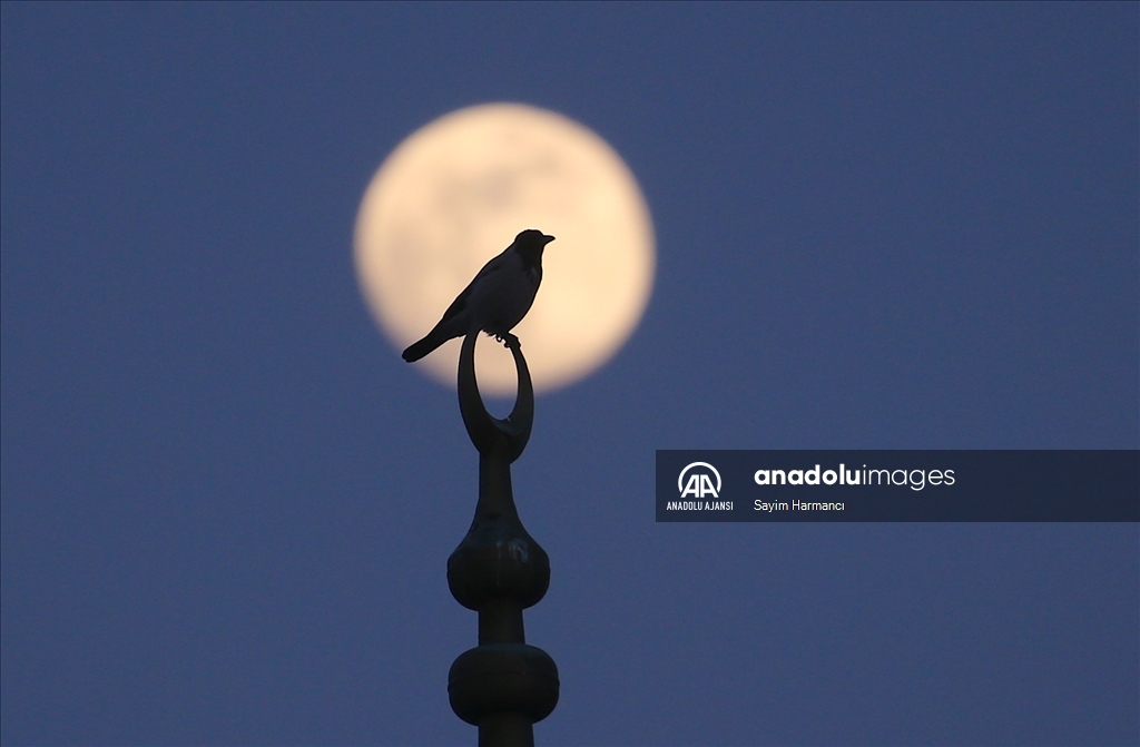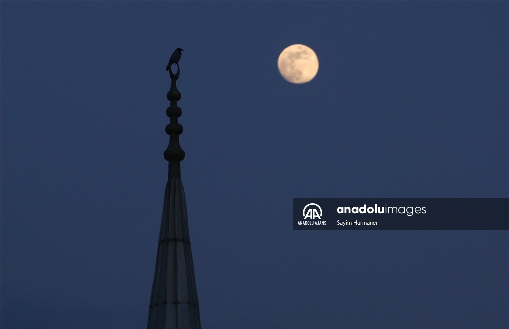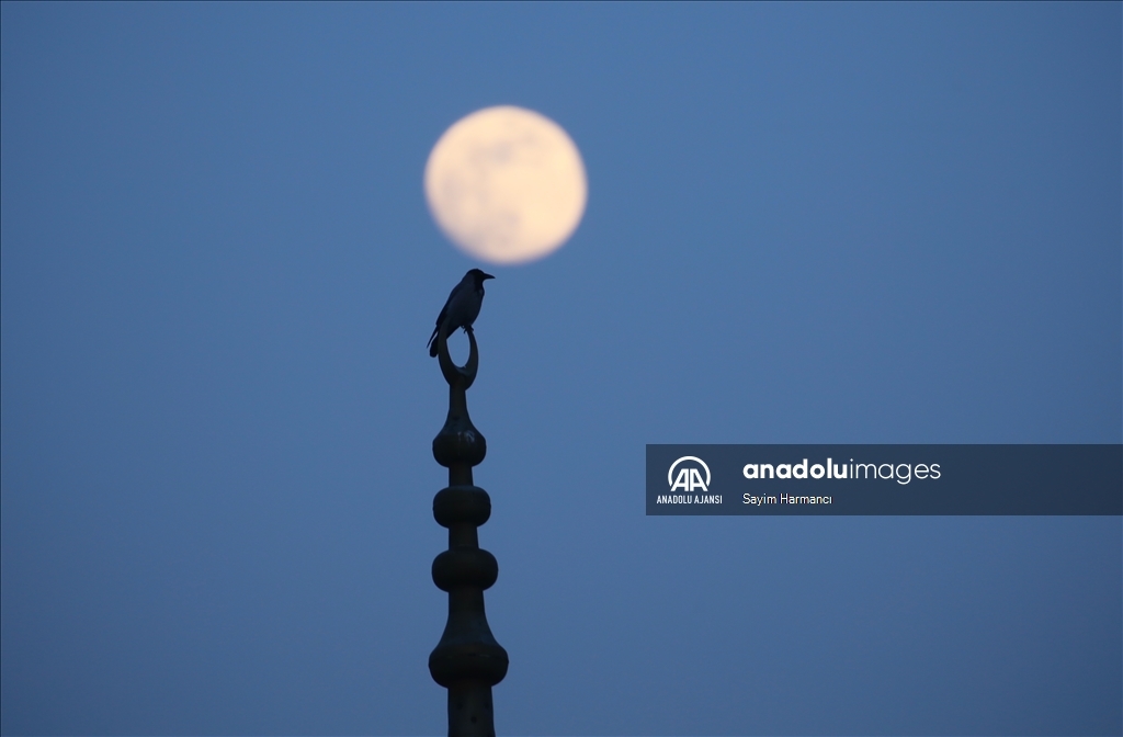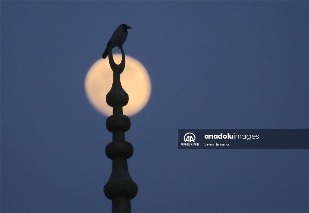 Hakkari'de akşam saatlerinde beliren dolunay, bir Caminin minare alemine konan kuş ile görüntülendi. ( Sayim Harmancı - Anadolu Ajansı )Sayim Harmancı