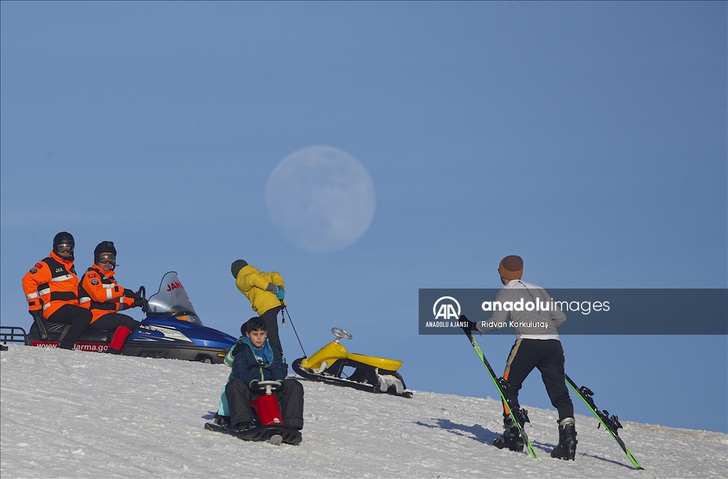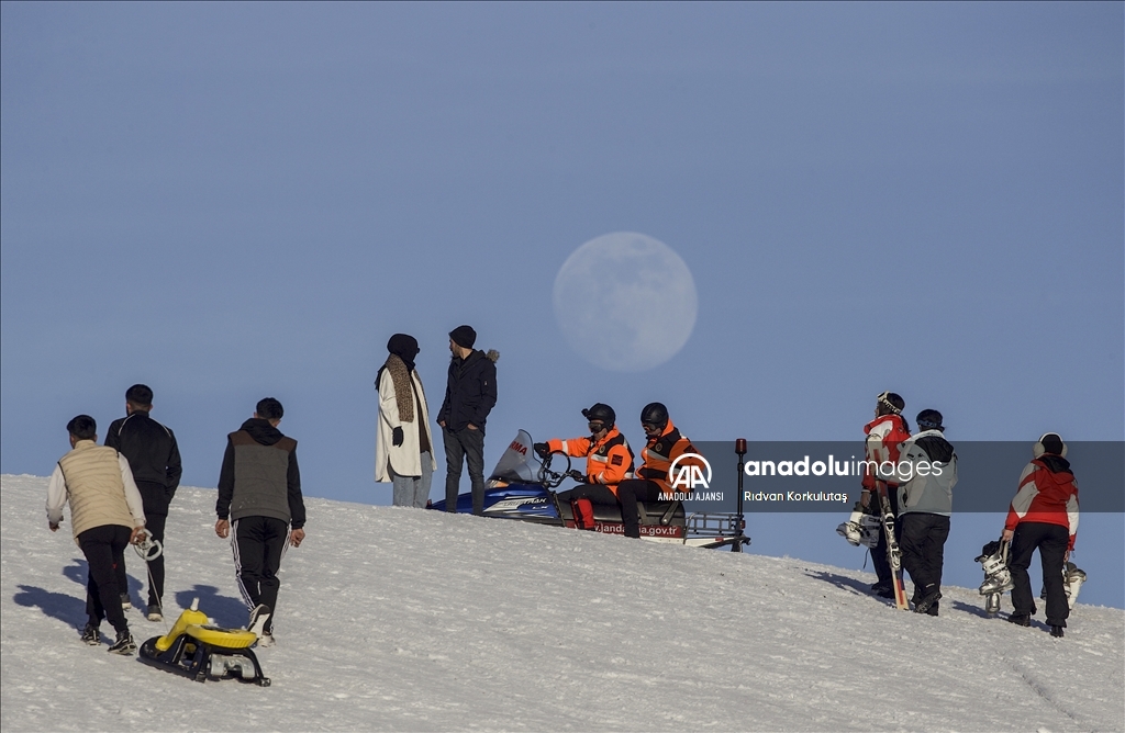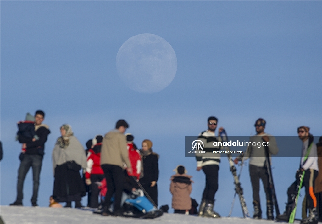 Bingöl'de gökyüzünde beliren dolunay, Hesarek Kayak Merkezi'nde kayak yapan vatandaşlarla birlikte görüntülendi. ( Rıdvan Korkulutaş - Anadolu Ajansı )Rıdvan Korkulutaş