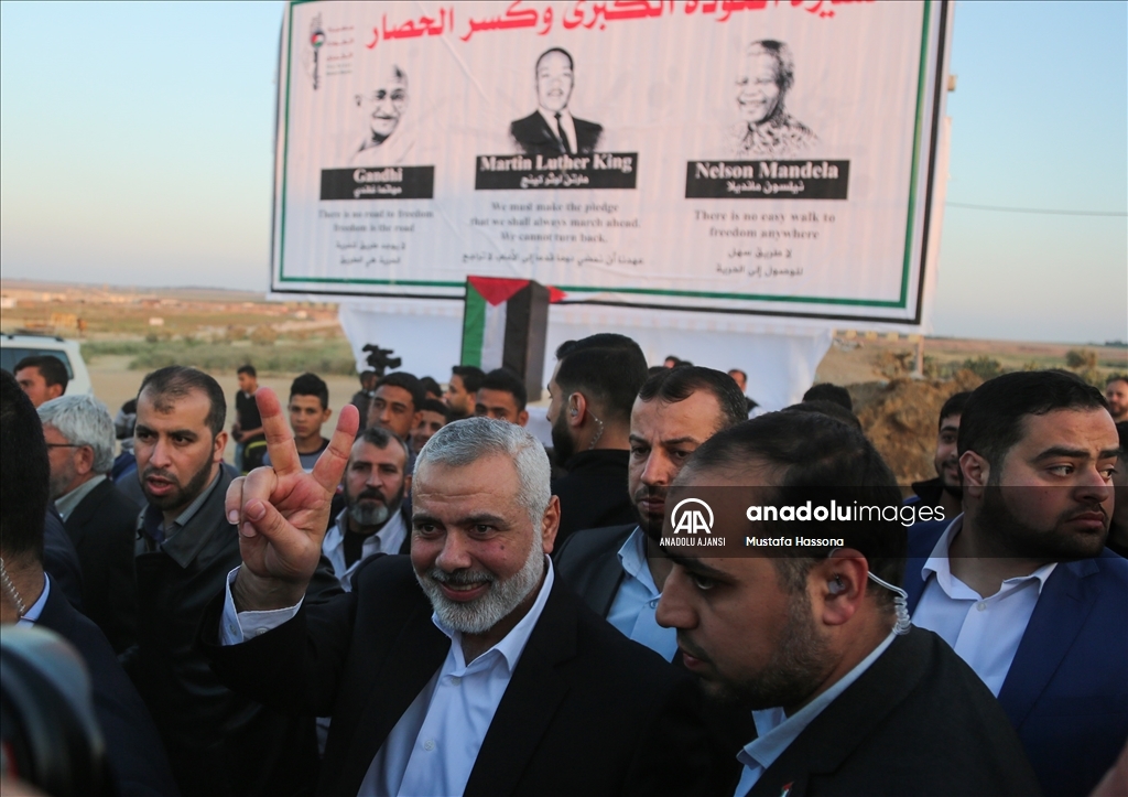 Hamas'ın Siyasi Büro Başkanı İsmail Heniyye (sağ 2), Gazze'nin doğusunda İsrail sınırındaki "Büyük Dönüş Yürüyüşü" göstericileri için kurulan çadır alanına gelerek burada konuşma yapmıştı.Mustafa Hassona