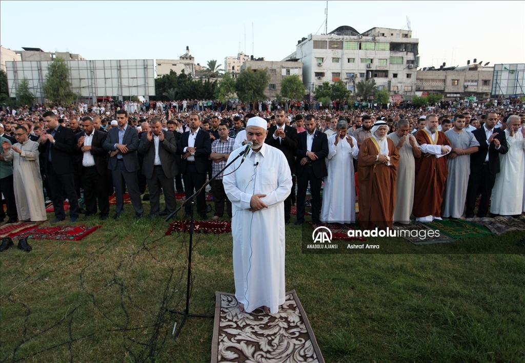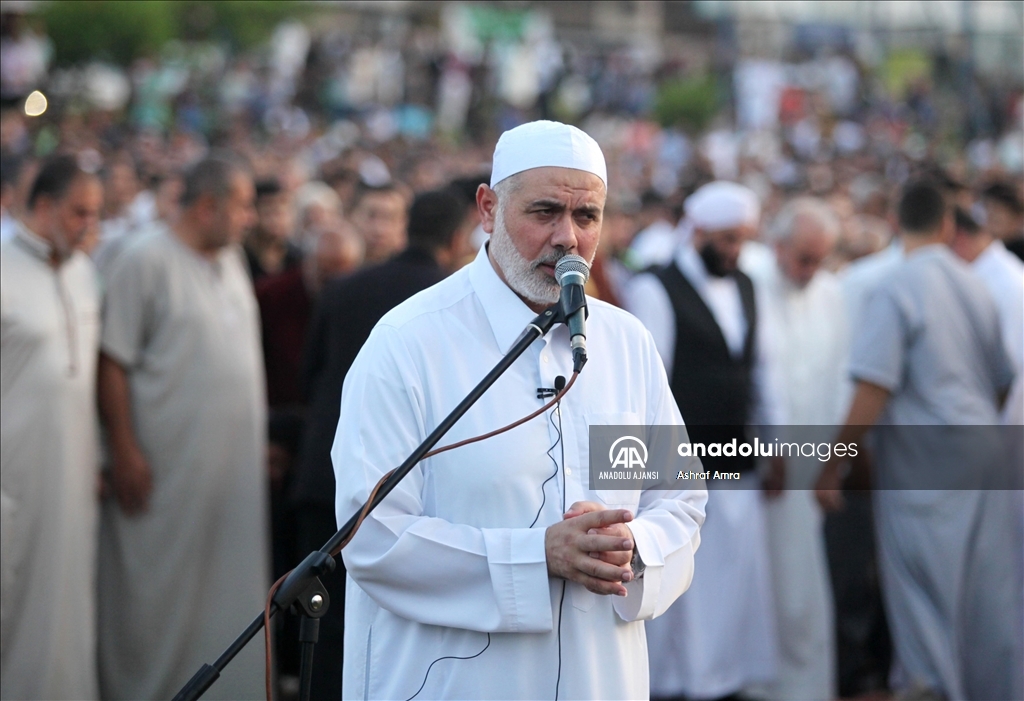 İsrail ablukası altındaki Gazze'de bayram namazını Es-Saraya alanında Hamas Siyasi Büro Başkanı İsmail Heniyye kıldırmıştı. (Ashraf Amra - Anadolu Ajansı)Ashraf Amra