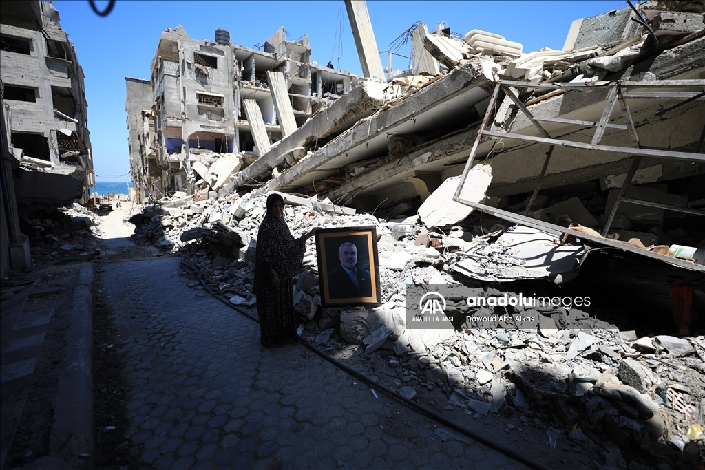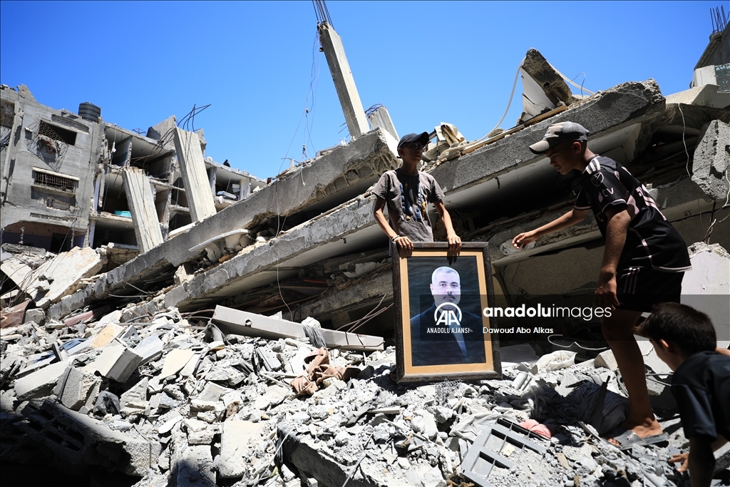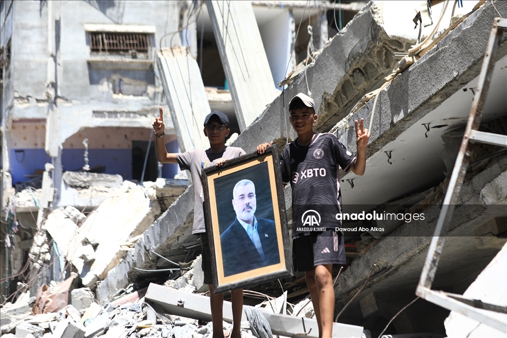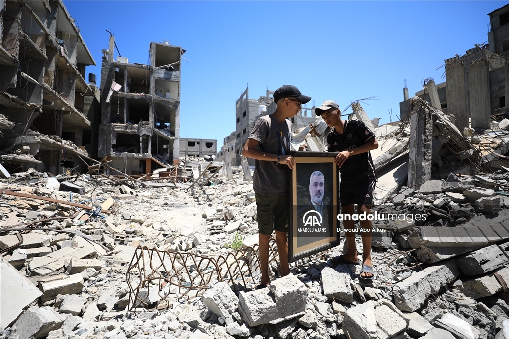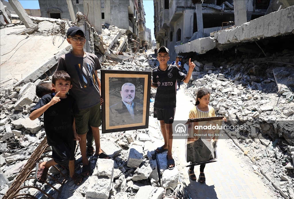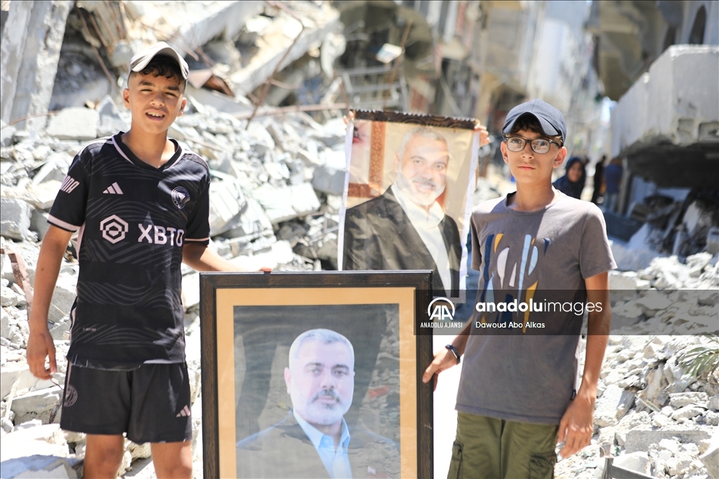 Hamas Siyasi Büro Başkanı İsmail Heniyye'ye İran'ın başkenti Tahran'da suikasta uğramasının ardından Gazze'nin eş-Şati Mülteci Kampı'nda İsrail saldırılarında yıkılan evinin önünde toplanan Filistinliler, Heniyye'nin fotoğrafını taşıdı. (Dawoud Abo Alkas - Anadolu Ajansı)Dawoud Abo Alkas
