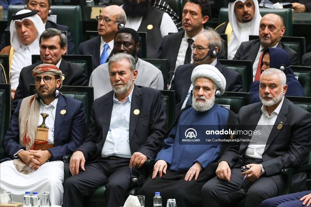 Dün İran Meclisi'nde düzenlenen 9'uncu Cumhurbaşkanı Mesud Pezeşkiyan'ın yemin törenine, Hamas Siyasi Büro Başkanı İsmail Heniyye (sağda), Hizbullah Genel Sekreter Yardımcısı Şeyh Naim Kasım (sağ 2), Filistin İslami Cihad Hareketi Genel Sekreteri Ziyad en-Nahhale (sol 2) ve Yemen'deki İran destekli Husilerin Sözcüsü Muhammed Abdusselam (solda) katılmıştı. (İran Cumhurbaşkanlığı/Handout - Anadolu Ajansı)İran Cumhurbaşkanlığı/Handout
