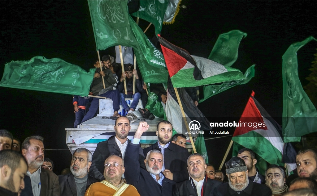 ABD'nin Kudüs'ü İsrail'in başkenti olarak tanıma kararı, Gazze'de düzenlenen gösteriyle protesto edilmiş, gösteriye Hamas Siyasi Büro Başkanı İsmail Heniyye (sağ 5) ve Hamas yetkilileri de katılmıştı. (Ali Jadallah - Anadolu Ajansı)Ali Jadallah