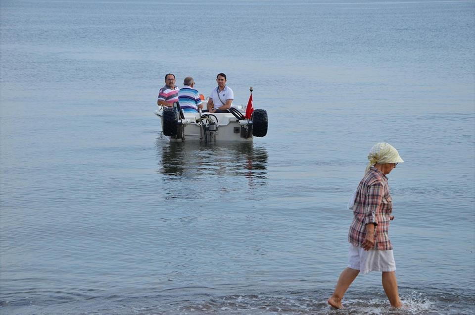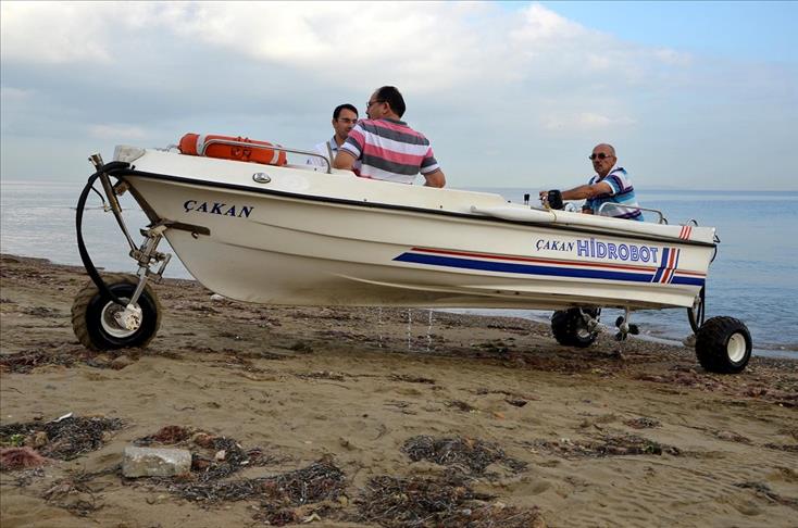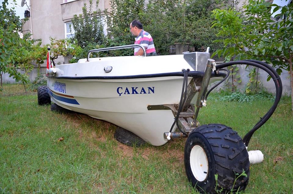 Çiftlikköy ilçesinde yaşayan hidrolik ustası Salih Çakan (62), atölyeye dönüştürdüğü evinin bir bölümünde, teknesinin hem karada hem de denizde yol alabilmesi için sistem geliştirdi. (İsmail Ersan - Anadolu Ajansı)İsmail Ersan