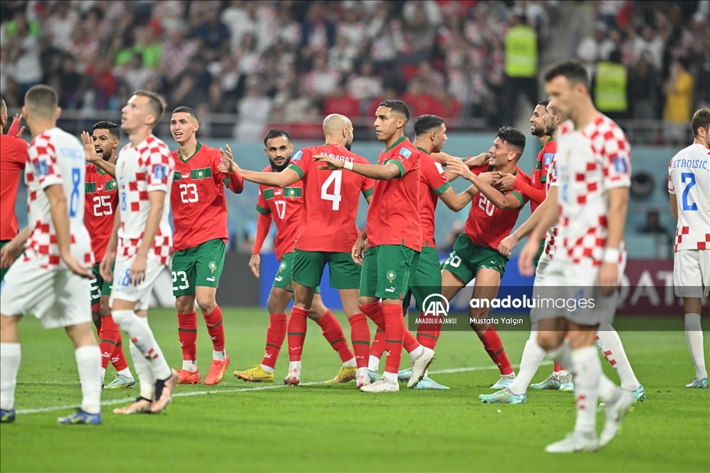 Katar'ın ev sahipliğini yaptığı 2022 FIFA Dünya Kupası üçüncülük maçında Hırvatistan ile Fas takımları, Khalifa International Stadyumu'nda karşılaştı. Bir pozisyonda, Faslı futbolcular gol sevinci yaşadı. ( Mustafa Yalçın - Anadolu Ajansı )Mustafa Yalçın
