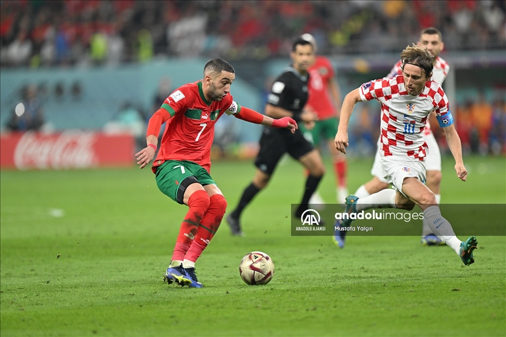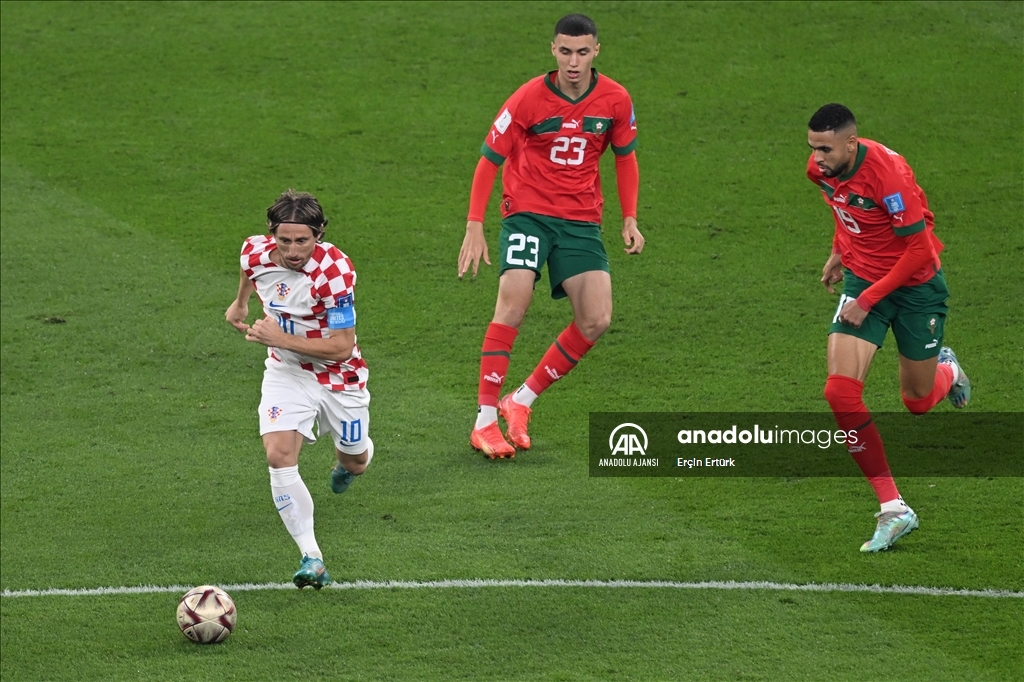 Katar'ın ev sahipliğini yaptığı 2022 FIFA Dünya Kupası üçüncülük maçında Hırvatistan ile Fas takımları, Khalifa International Stadyumu'nda karşılaştı. Hırvatistan takımından Luka Modric (10), bir pozisyonda Fas takımından Hakim Ziyech (7) ile mücadele etti.