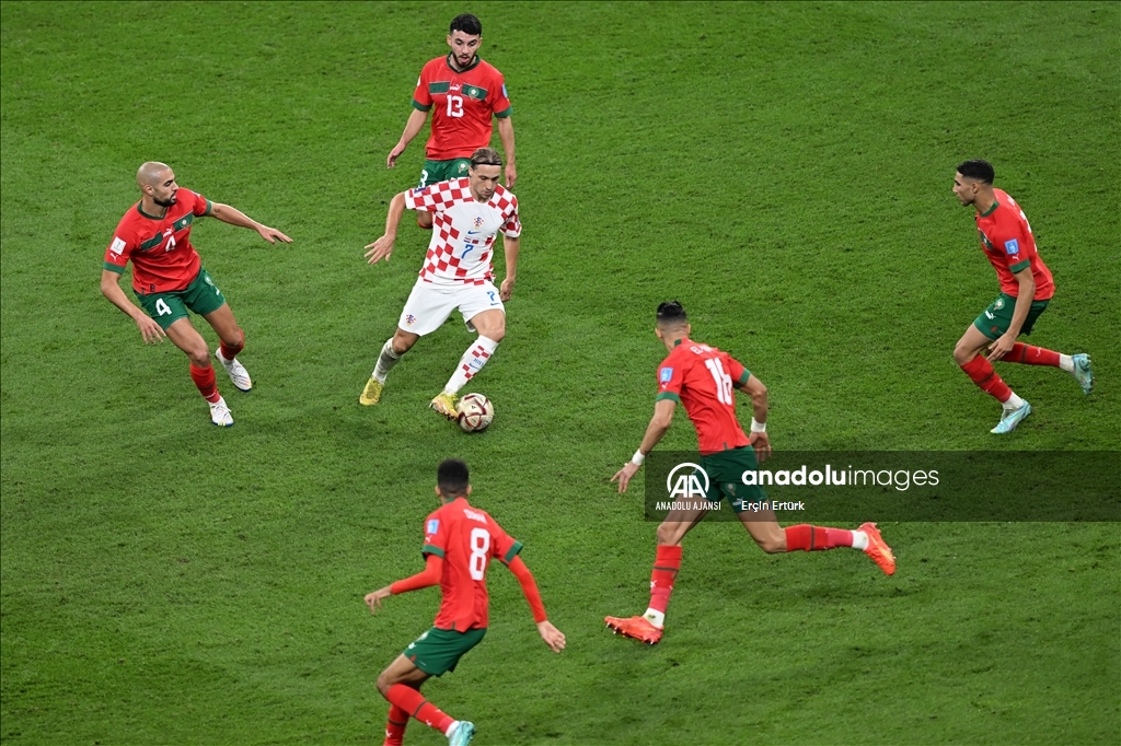 Katar'ın ev sahipliğini yaptığı 2022 FIFA Dünya Kupası üçüncülük maçında Hırvatistan ile Fas takımları, Khalifa International Stadyumu'nda karşılaştı. Bir pozisyonda, Hırvatistan takımı oyuncusu Lovro Majer (7), rakipleriyle mücadele etti. ( Erçin Ertürk - Anadolu Ajansı )Erçin Ertürk