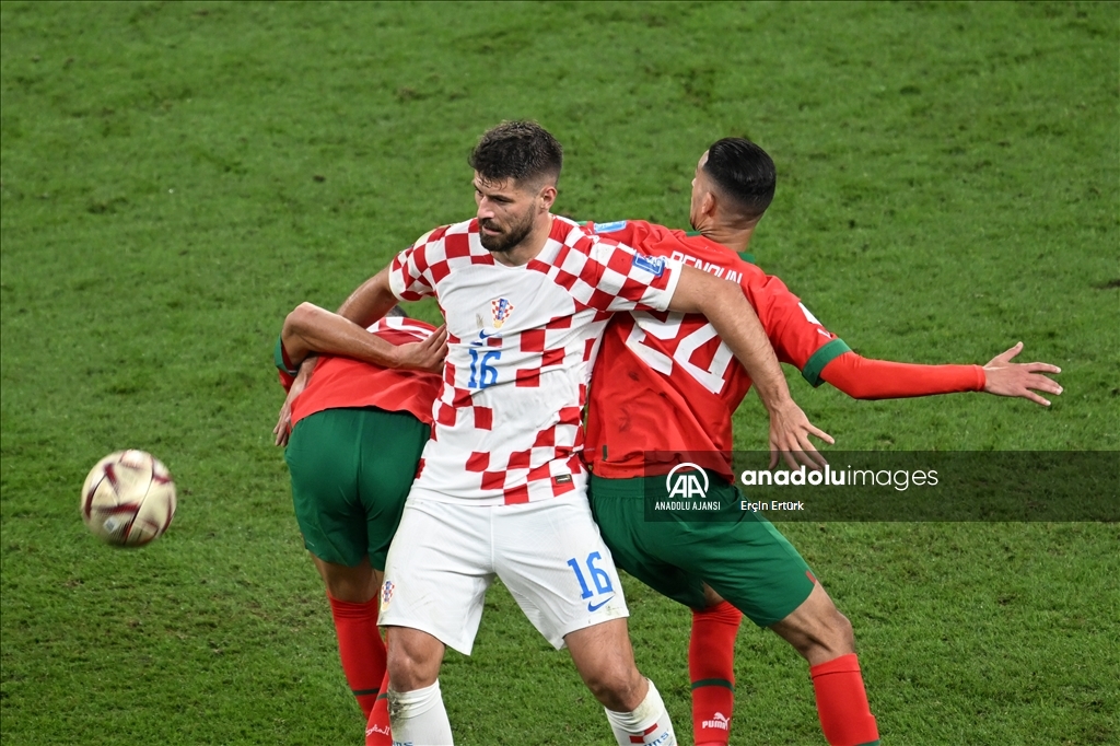 Katar'ın ev sahipliğini yaptığı 2022 FIFA Dünya Kupası üçüncülük maçında Hırvatistan ile Fas takımları, Khalifa International Stadyumu'nda karşılaştı. Bir pozisyonda, Hırvatistan takımından Bruno Petkovic (16), Fas takımı oyuncusu Selim Amallah (solda) ve Badr Benoun (sağda) ile mücadele etti.