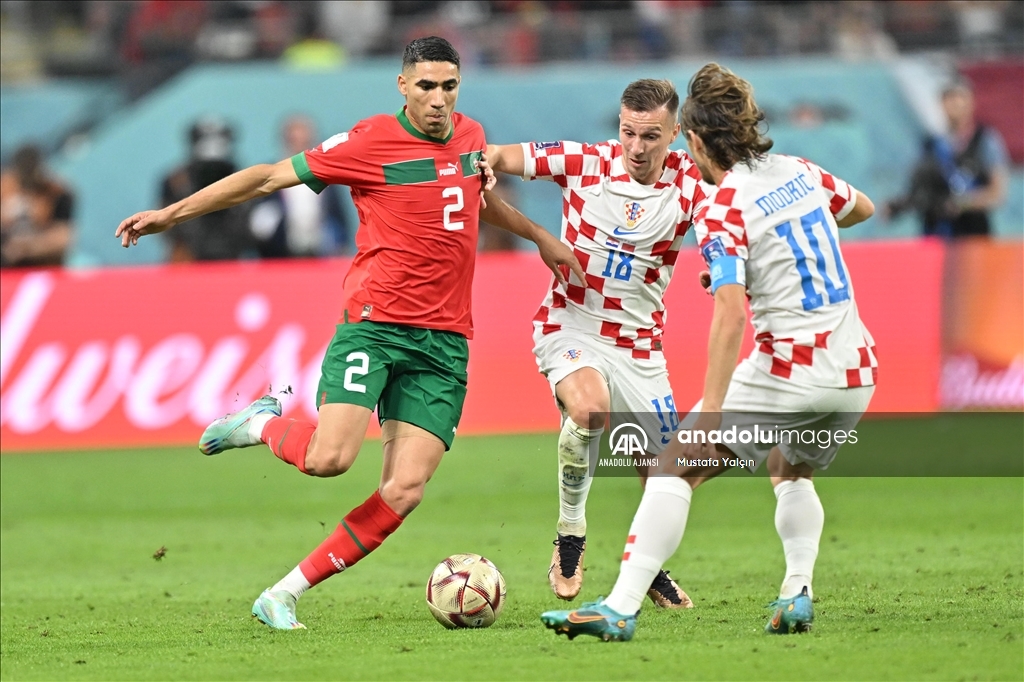 Katar'ın ev sahipliğini yaptığı 2022 FIFA Dünya Kupası üçüncülük maçında Hırvatistan ile Fas takımları, Khalifa International Stadyumu'nda karşılaştı. Hırvatistan takımından Luka Modric (10), bir pozisyonda Fas takımından Achraf Hakimi (2) ile mücadele etti. ( Mustafa Yalçın - Anadolu Ajansı )Mustafa Yalçın
