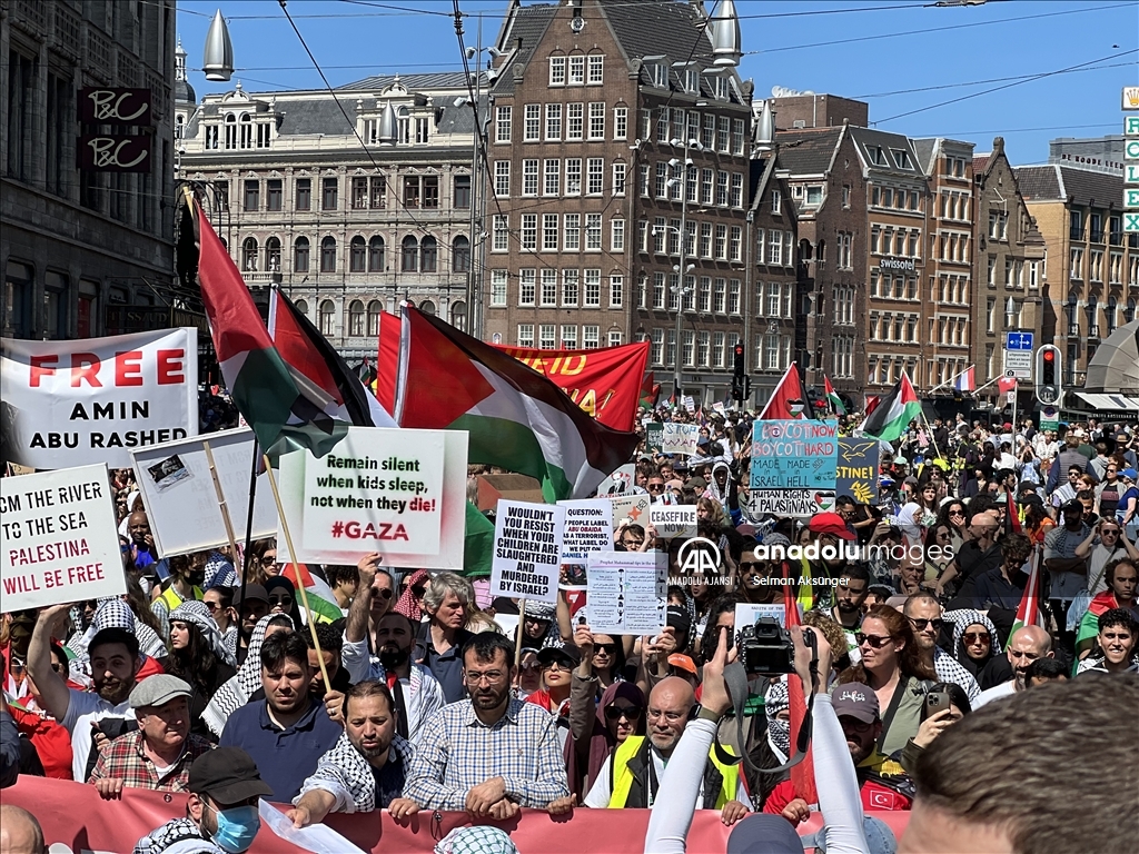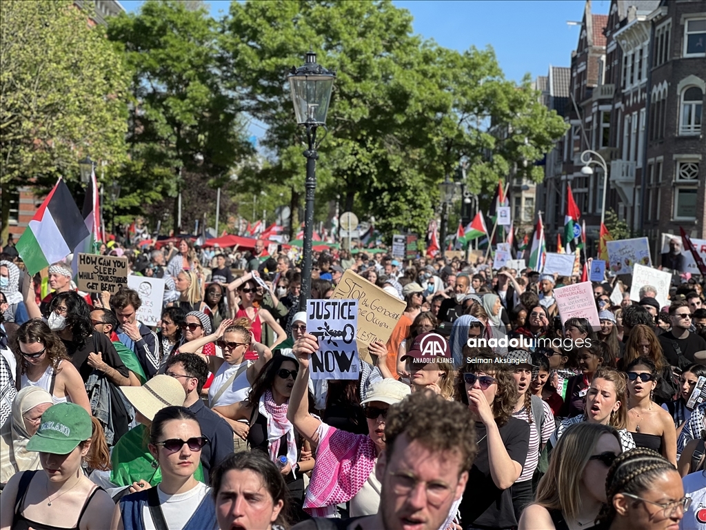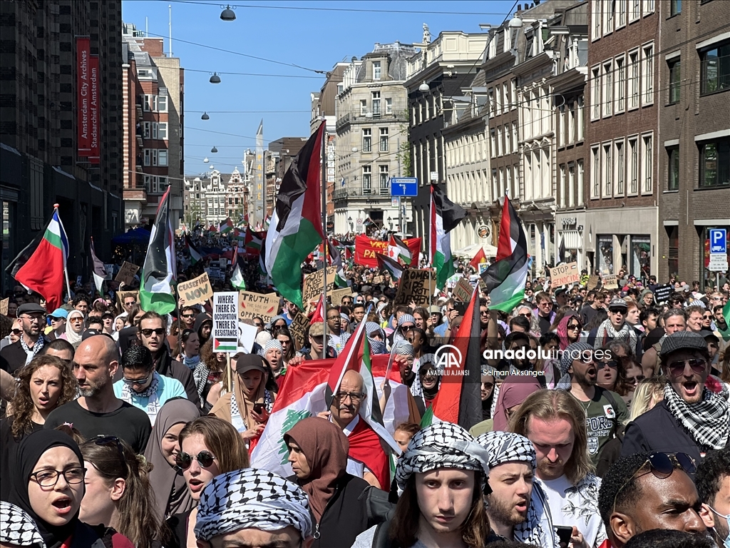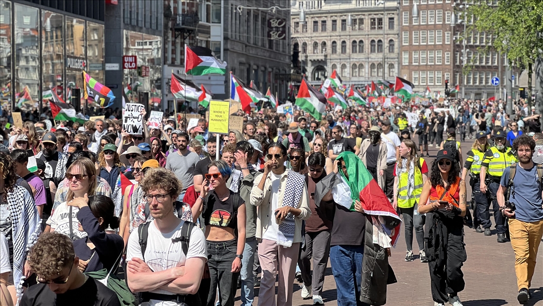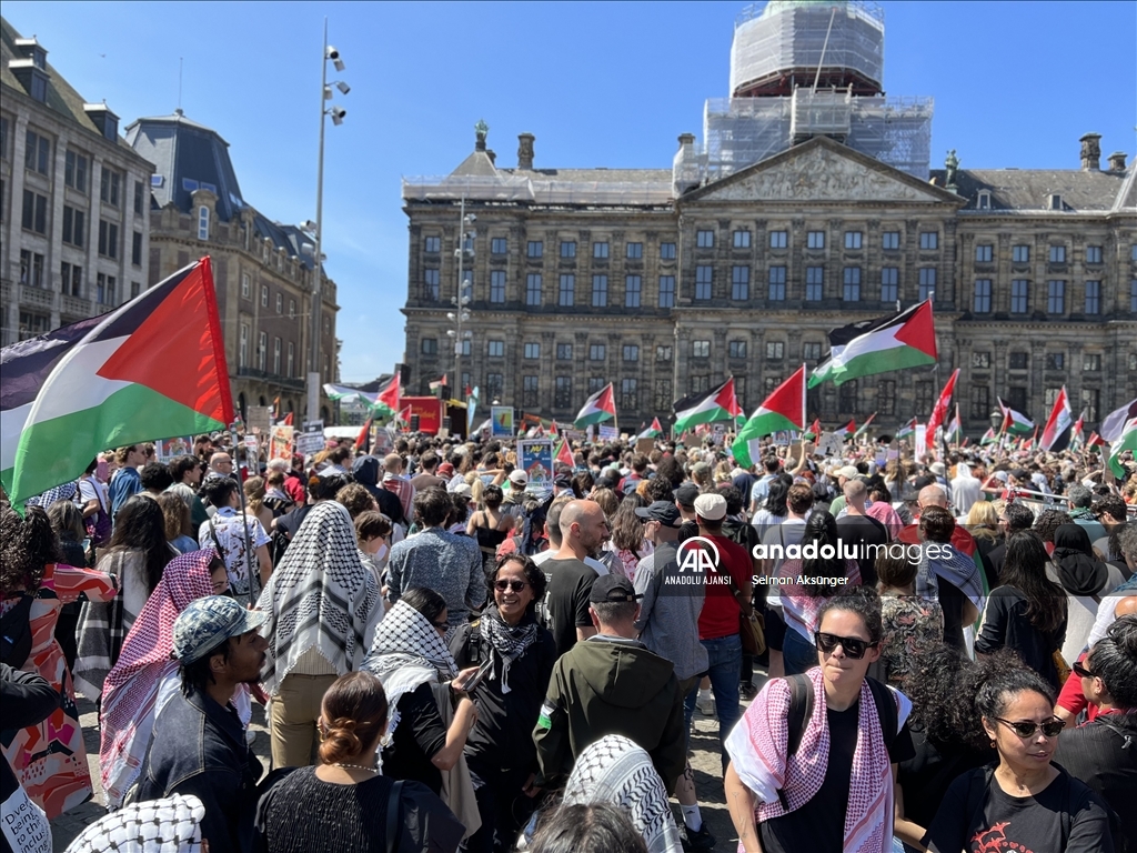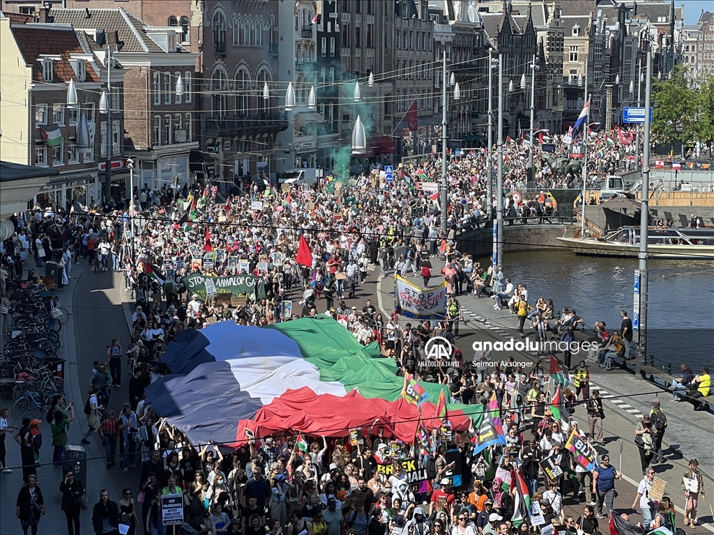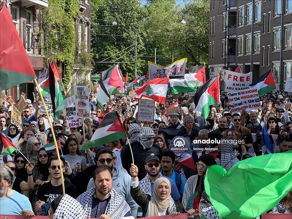 Hollanda'nın başkenti Amsterdam'da yaklaşık 15 bin kişi, Nekbe (Büyük Felaket) ve İsrail'in Gazze'deki saldırılarını protesto etti.