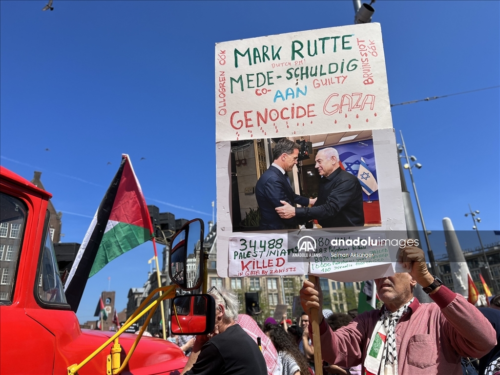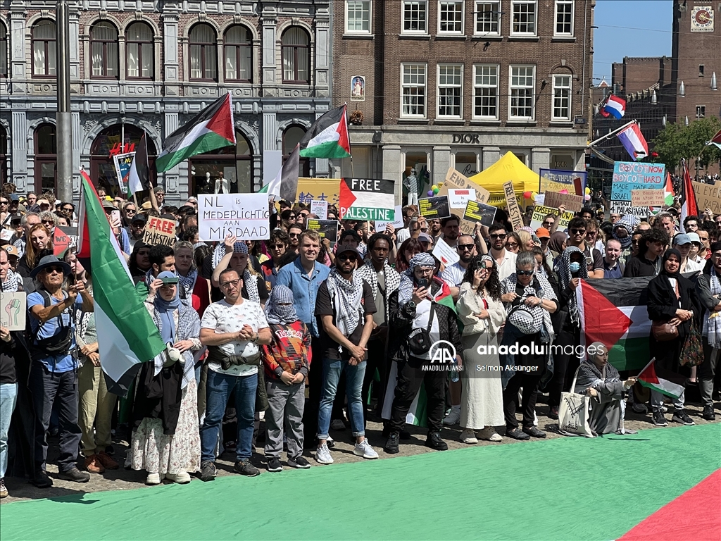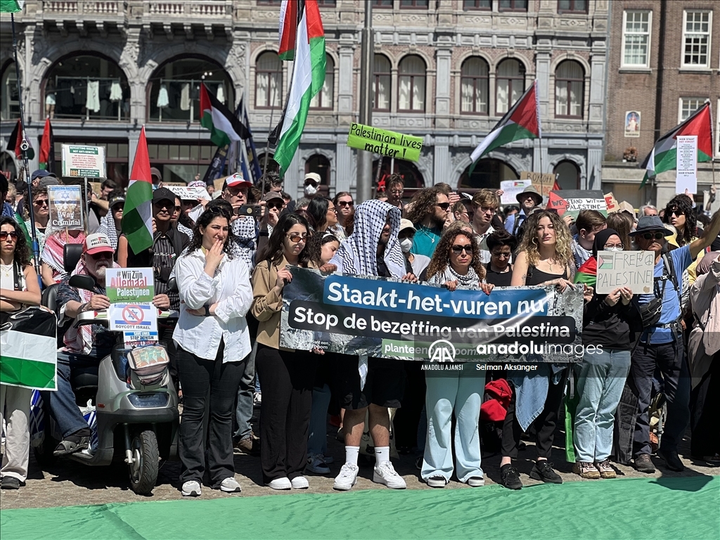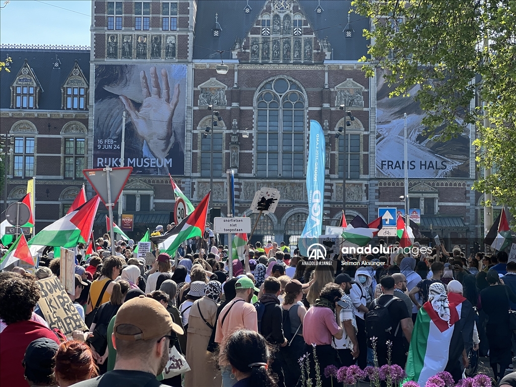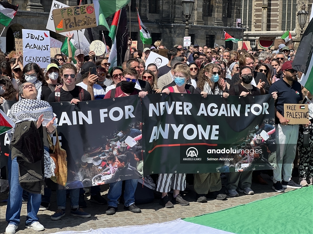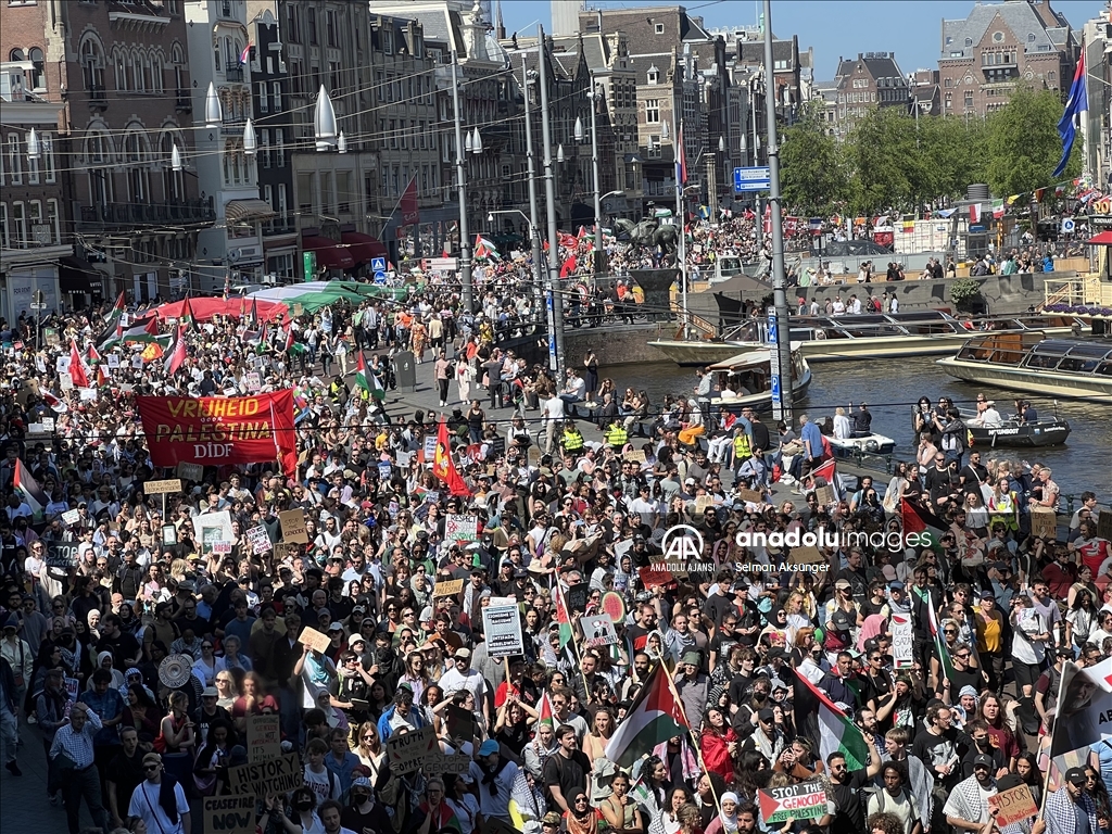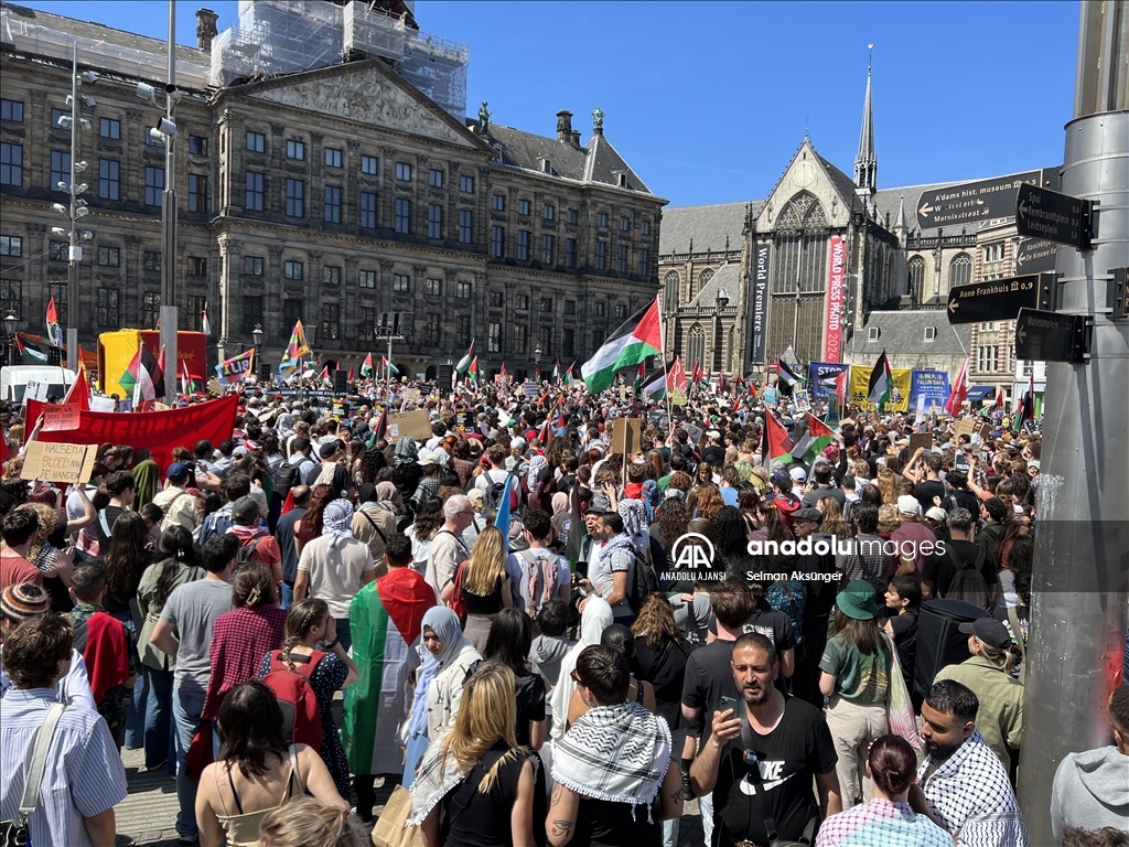 Hollanda'nın başkenti Amsterdam'da yaklaşık 15 bin kişi, Nekbe (Büyük Felaket) ve İsrail'in Gazze'deki saldırılarını protesto etti.