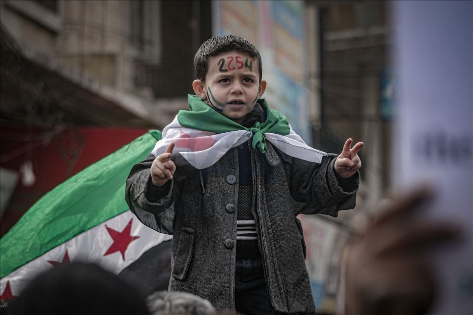 Türkiye ile Rusya arasında İdlib’in istikrara kavuşturulması için varılan mutabakattan sonra kent merkezinde Türkiye’ye destek gösterisi yapıldı. Bazı göstericiler, Birleşmiş Milletler (BM) Güvenlik Konseyi'nin Suriye'de siyasi geçişi öngören 2254 sayılı kararını hatırlatmak için dövizler taşırken, bu rakamların bir çocuğun alnına yazılı olduğu dikkati çekti. ( Muhammed Said - Anadolu Ajansı )Muhammed Said