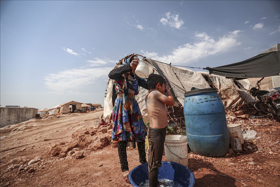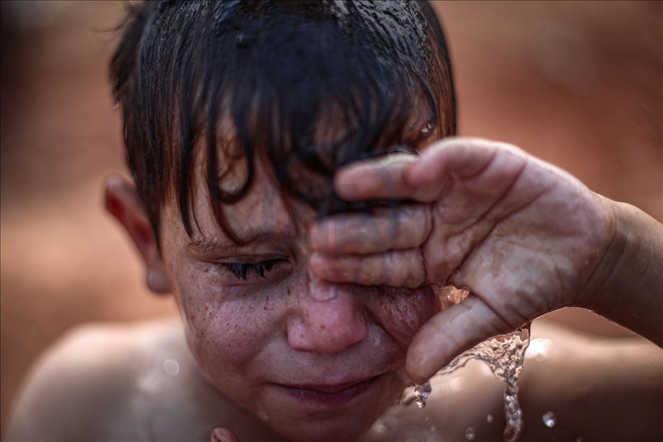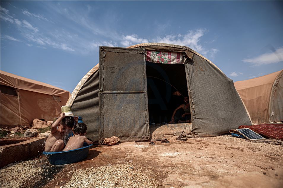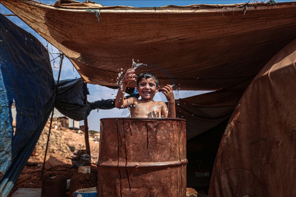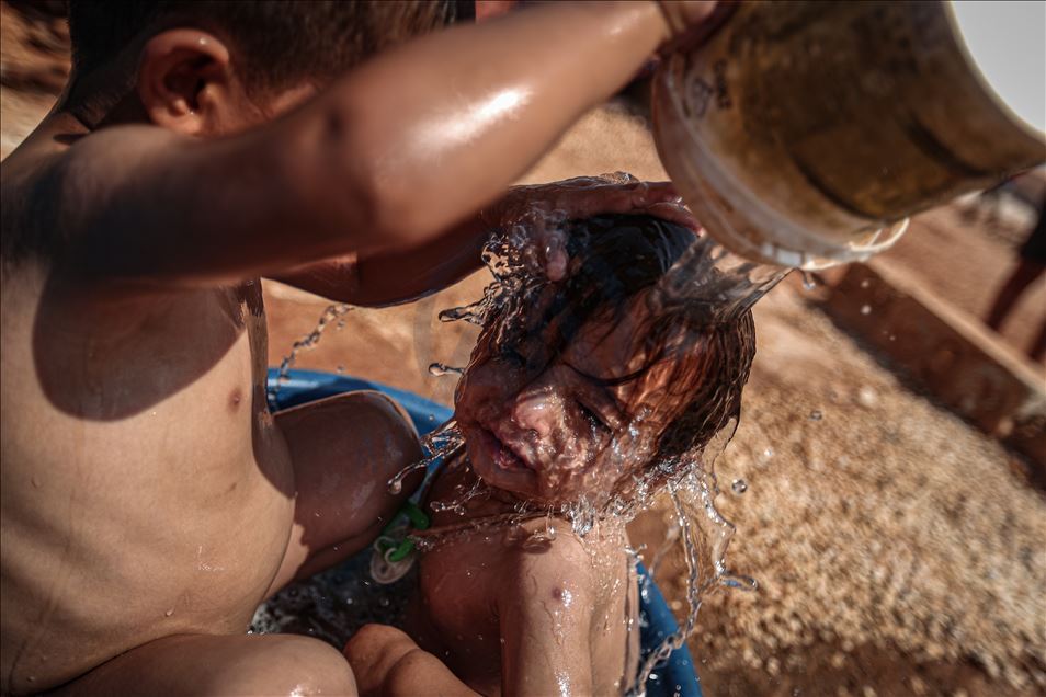 Suriye'nin kuzeybatısındaki İdlib ilinde zorla yerinden edilen sivillerin sığındığı kamplardaki siviller, aşırı sıcaklıklarla mücadele ediyor. Gün içinde 43 dereceye kadar çıkan sıcaklık, çoğunluğu kadın ve çocuğun yaşadığı çadırlarda zor anlara neden oluyor. Aşırı sıcaklardan bunalan çocuklar serinlemek için çareyi çeşitli yollara başvuruyor. ( Muhammed Said - Anadolu Ajansı )Muhammed Said