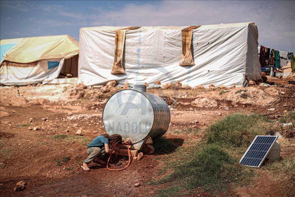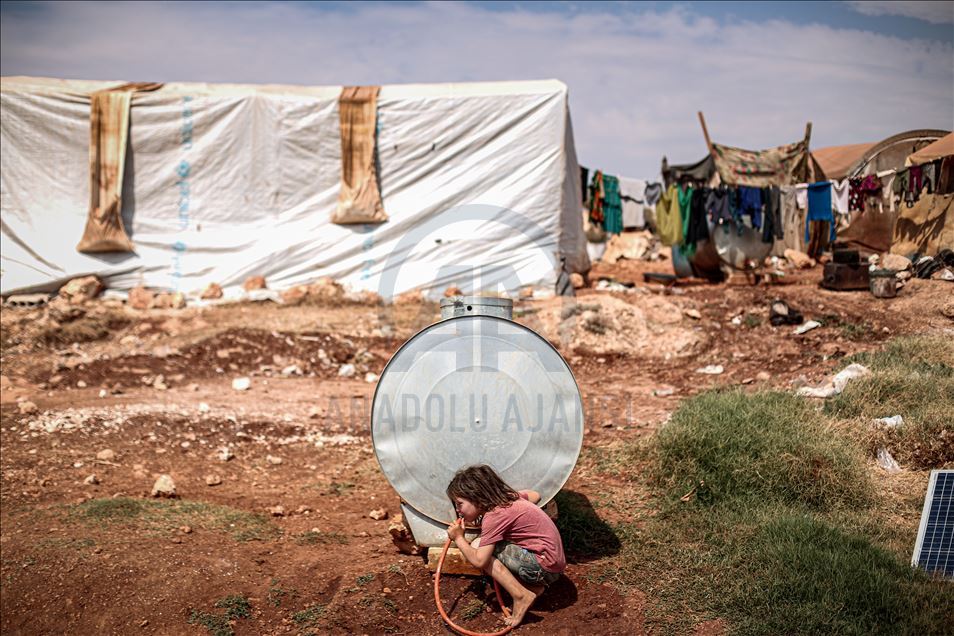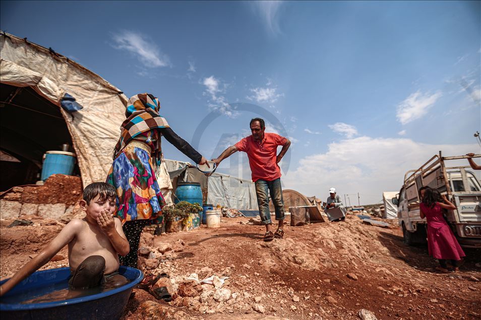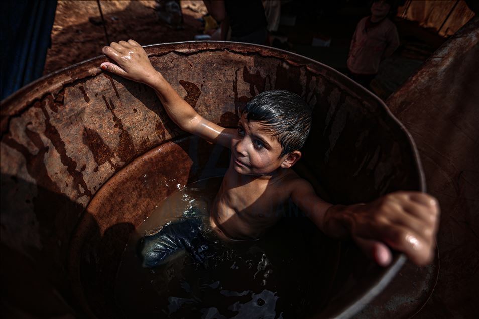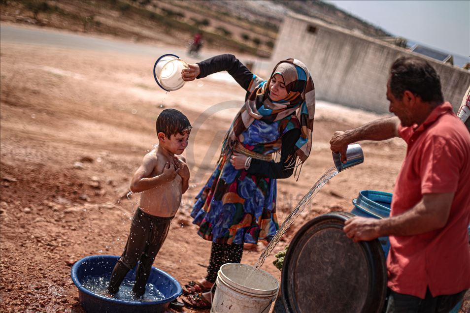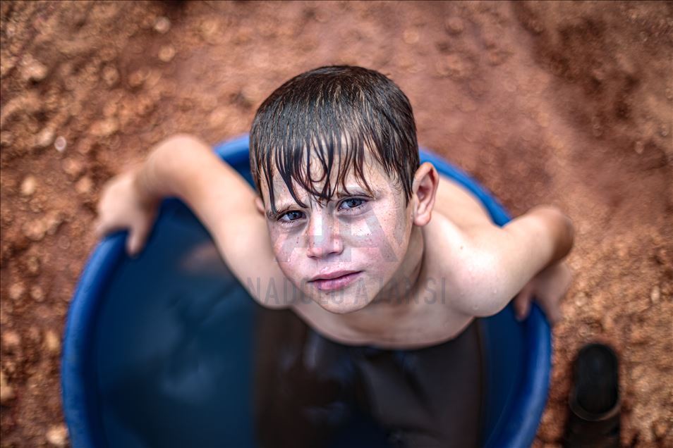 Suriye'nin kuzeybatısındaki İdlib ilinde zorla yerinden edilen sivillerin sığındığı kamplardaki siviller, aşırı sıcaklıklarla mücadele ediyor. Gün içinde 43 dereceye kadar çıkan sıcaklık, çoğunluğu kadın ve çocuğun yaşadığı çadırlarda zor anlara neden oluyor. Aşırı sıcaklardan bunalan çocuklar serinlemek için çareyi çeşitli yollara başvuruyor. ( Muhammed Said - Anadolu Ajansı )Muhammed Said