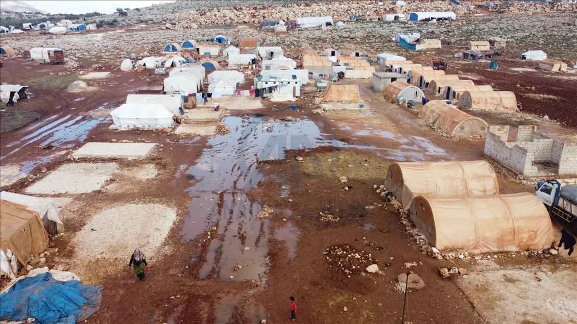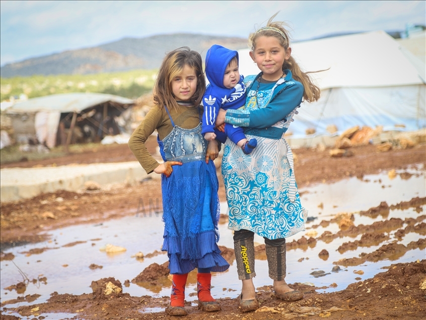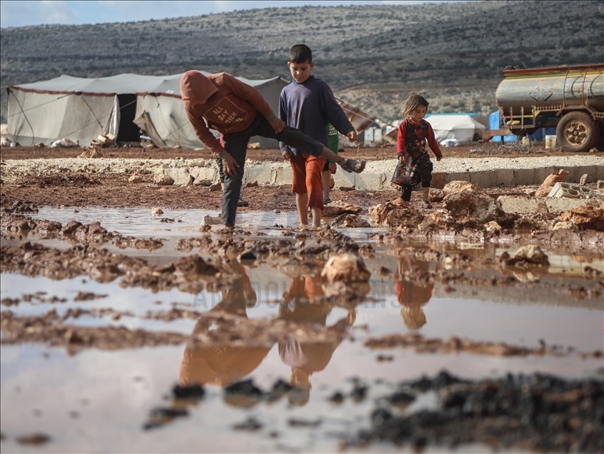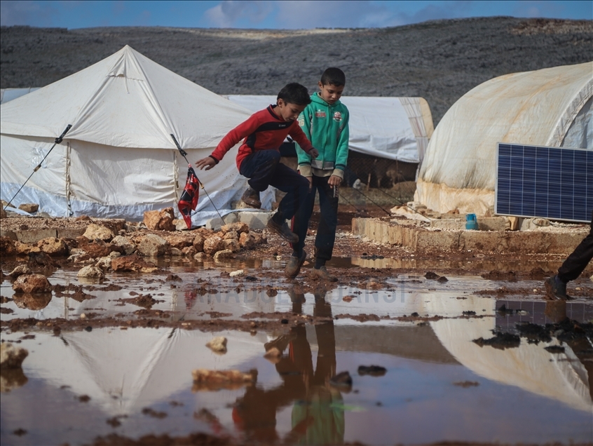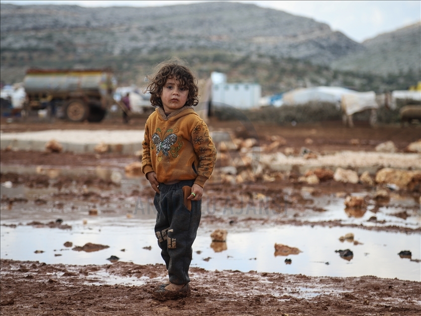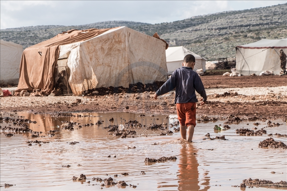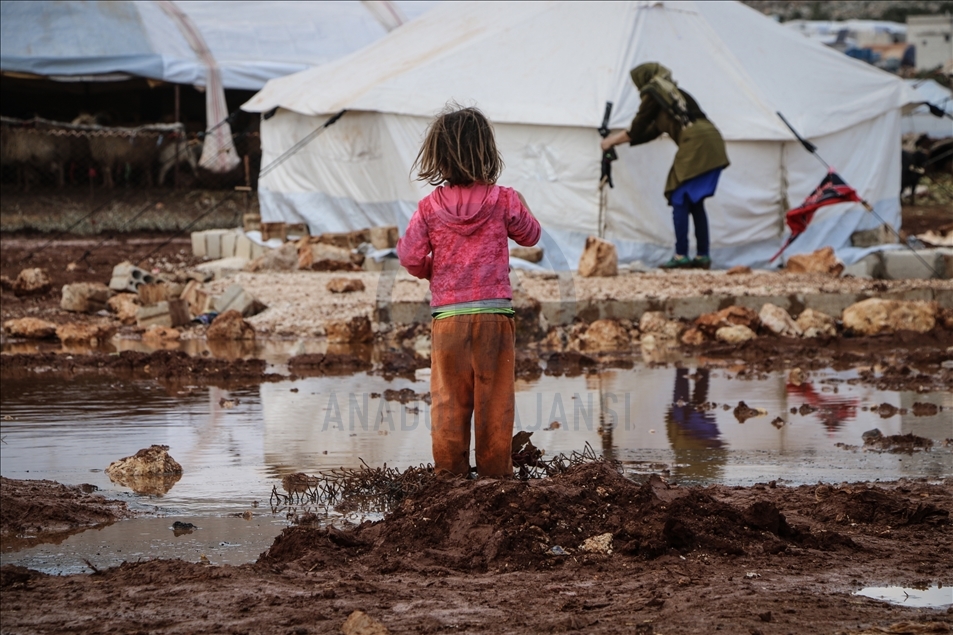Suriye'nin kuzeybatısındaki İdlib ilinde Beşşar Esed rejimi ve destekçilerinin saldırılarından kaçarak sığındıkları derme çatma çadırlarını sağanak nedeniyle su basan siviller, yaşam mücadelesi veriyor. Çadırların çevresini çamur kaplarken, çıplak ayağına ya terlik ya plastik bot giymiş çocuklar, bata çıka oyun oynuyor. ( Muhammed Abdullah - Anadolu Ajansı )Muhammed Abdullah