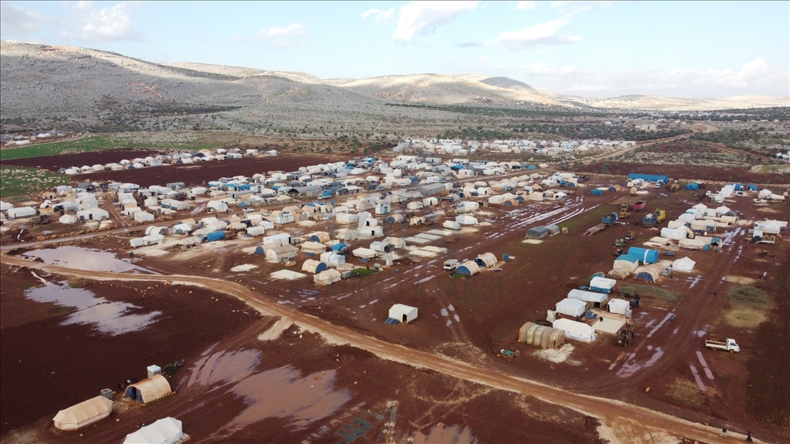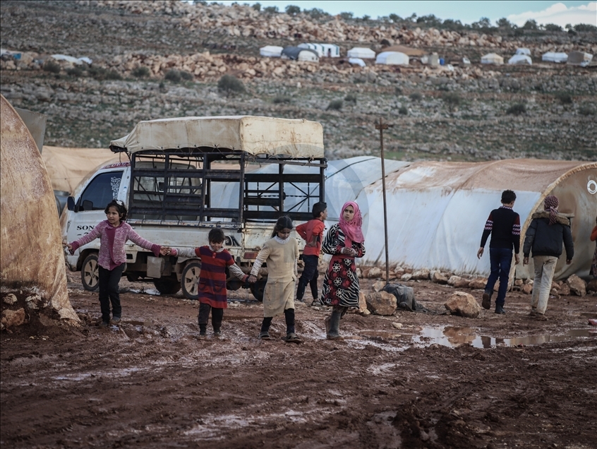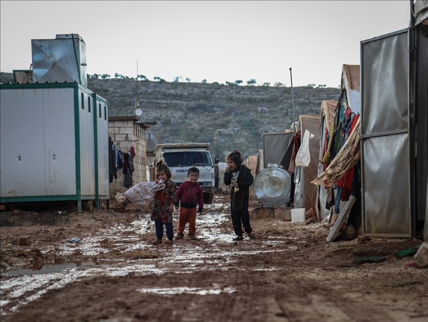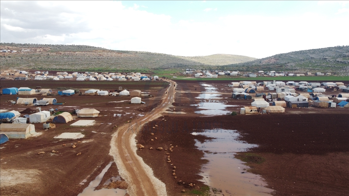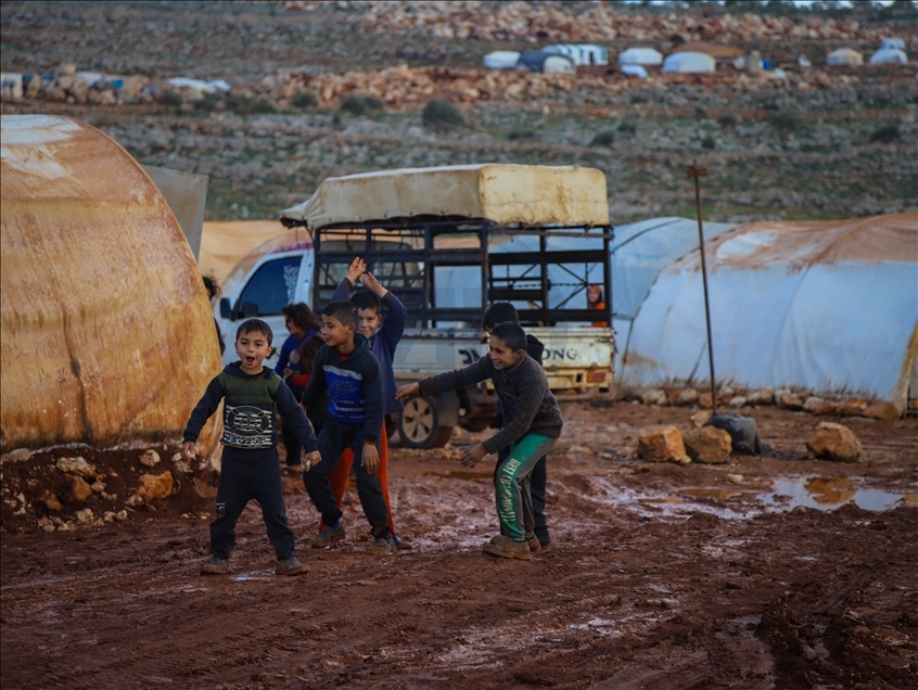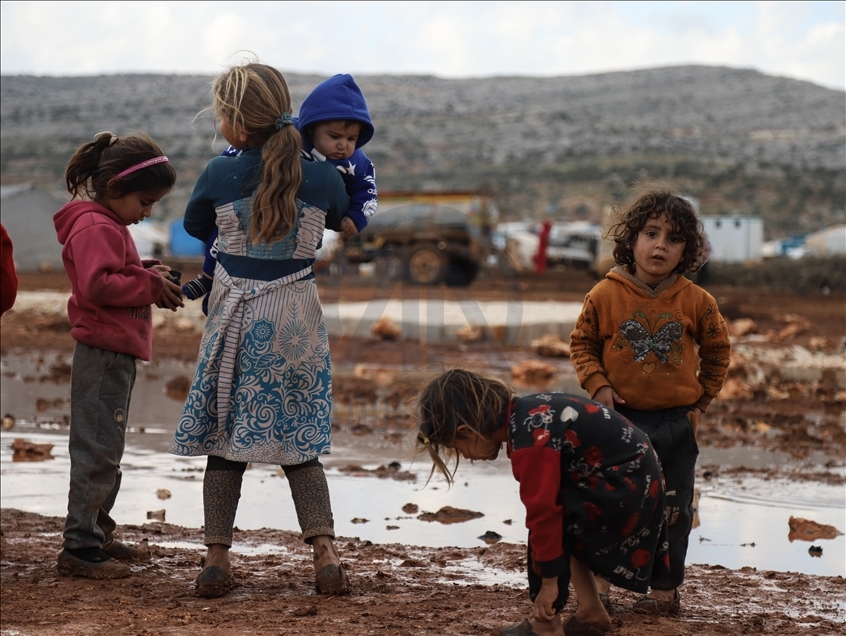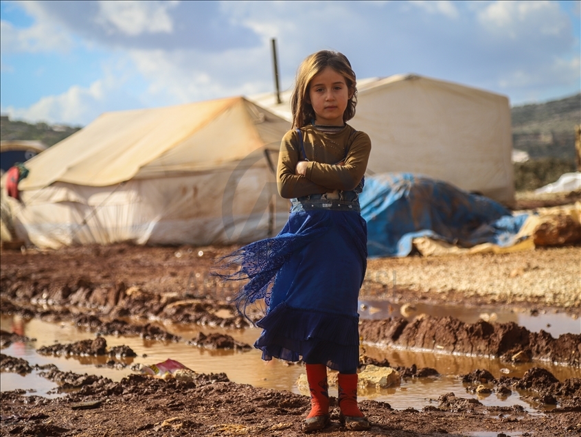 Suriye'nin kuzeybatısındaki İdlib ilinde Beşşar Esed rejimi ve destekçilerinin saldırılarından kaçarak sığındıkları derme çatma çadırlarını sağanak nedeniyle su basan siviller, yaşam mücadelesi veriyor. Çadırların çevresini çamur kaplarken, çıplak ayağına ya terlik ya plastik bot giymiş çocuklar, bata çıka oyun oynuyor. ( Muhammed Abdullah - Anadolu Ajansı )Muhammed Abdullah