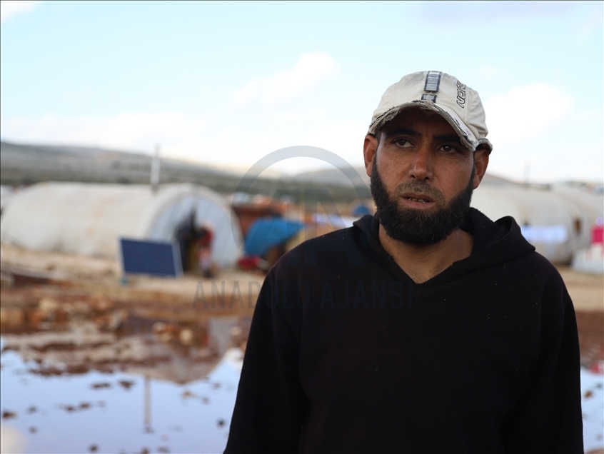 Suriye'nin kuzeybatısındaki İdlib ilinde Beşşar Esed rejimi ve destekçilerinin saldırılarından kaçarak sığındıkları derme çatma çadırlarını sağanak nedeniyle su basan siviller, yaşam mücadelesi veriyor. Esed rejiminin saldırılarıyla Serakib ilçesinden göç etmek zorunda kalan Ebu Ahmed, konuyla ilgili AA muhabirine açıklamalarda bulundu. ( Muhammed Abdullah - Anadolu Ajansı )Muhammed Abdullah