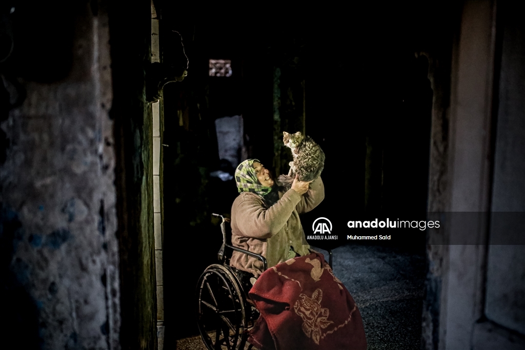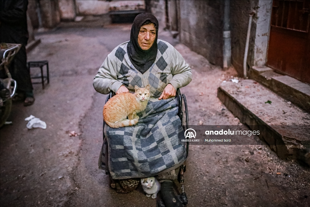 Beşşar Esed rejiminin saldırıları nedeniyle Suriye'nin kuzeybatısındaki İdlib ilinde yerinden edilen 61 yaşındaki İbtisem Seyid, tekerlekli sandalyesiyle dilenerek hem engelli oğluna hem de 10 kedisine bakıyor. ( Muhammed Said - Anadolu Ajansı )Muhammed Said