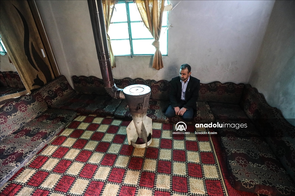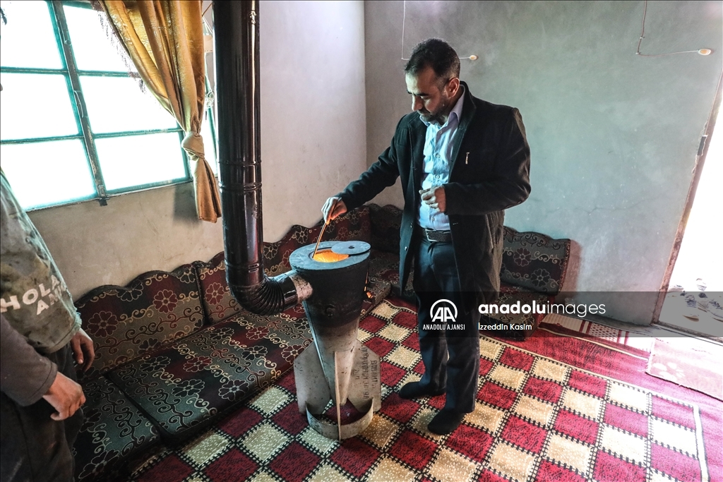 Suriye'nin İdlib iline bağlı Başiriye beldesinde yaşayan 35 yaşındaki Alaattin Osman, Beşşar Esed rejimi tarafından evine düşen roketin boş kovanını sobaya dönüştürerek, soğuk kış aylarında ailesiyle ısınıyor.