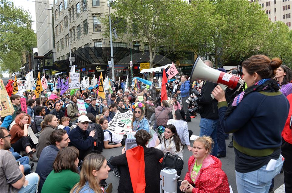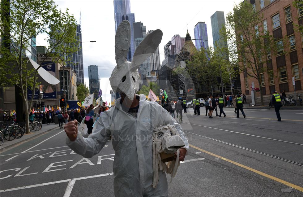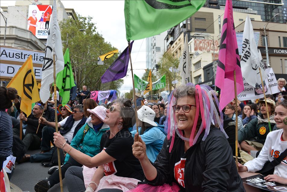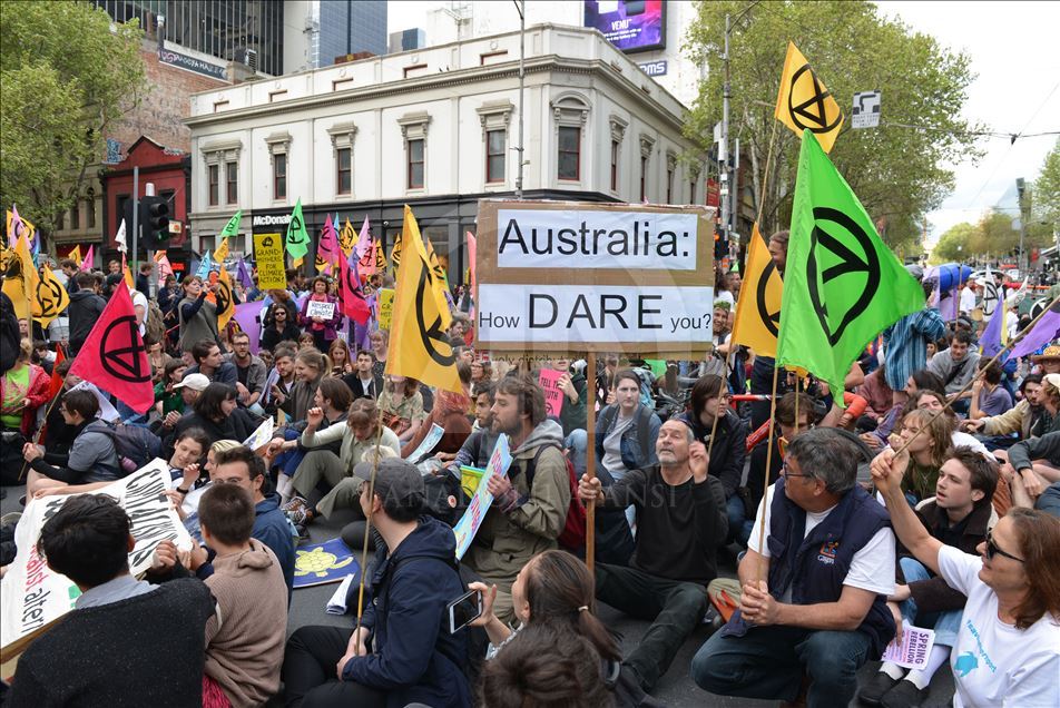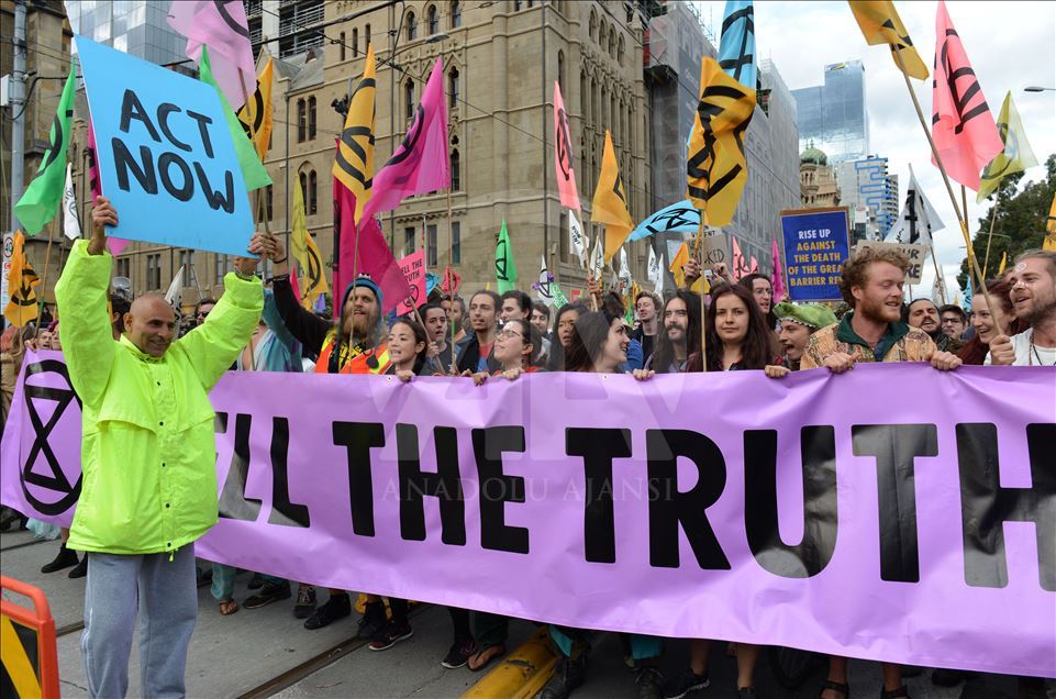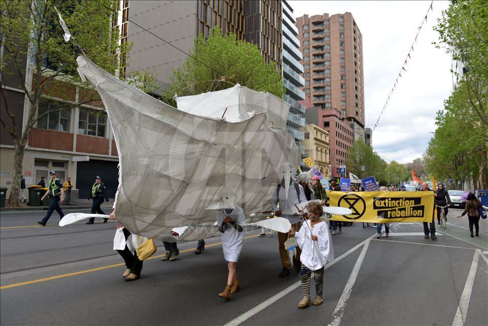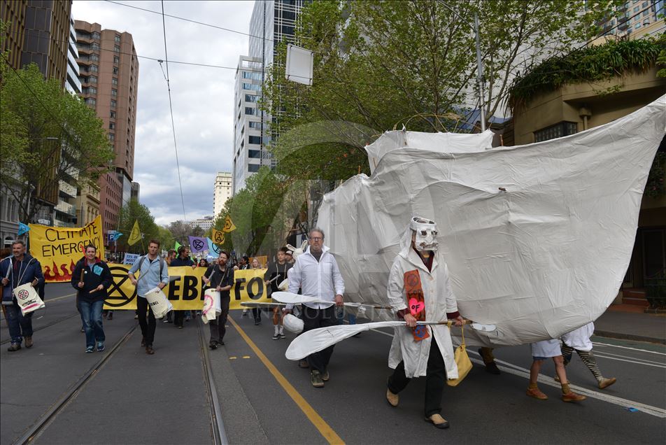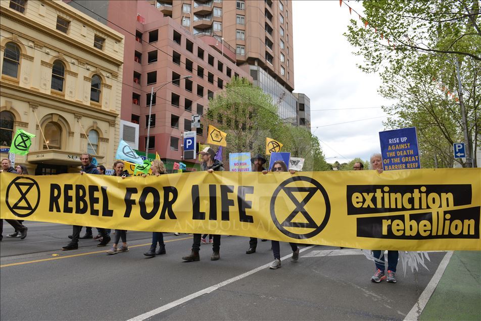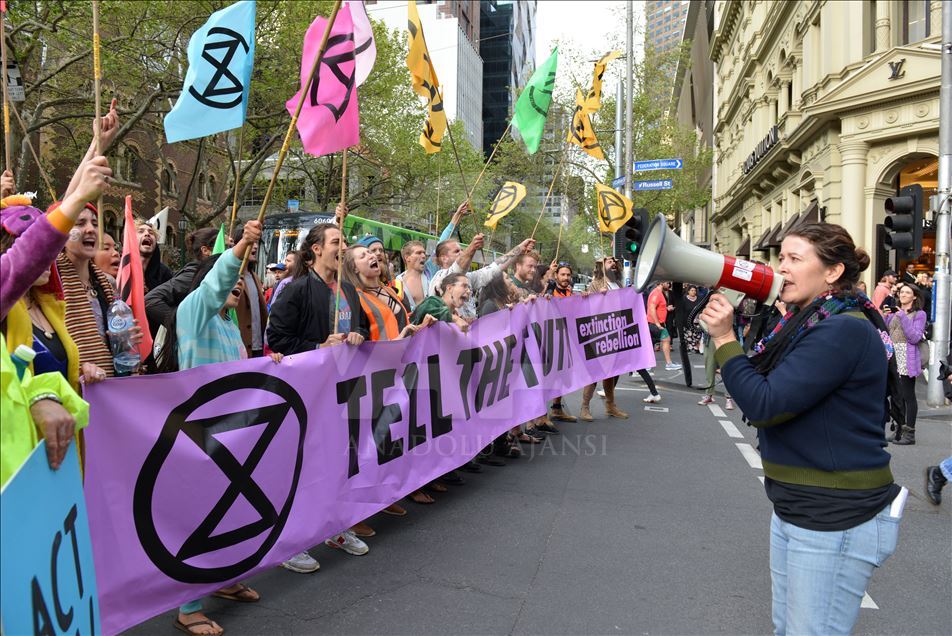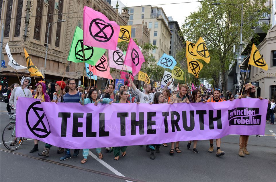 Extinction Rebellion (Yokoluş İsyanı) adlı grup üyelerinin dünya genelinde düzenlediği eylemlere paralel olarak Avustralya'nın Canberra, Sydney, Melbourne (Fotoğrafta), Brisbane ve Perth kentlerinde toplanan binlerce çevre aktivisti, eylem yaptı. ( Recep Şakar - Anadolu Ajansı )Recep Şakar
