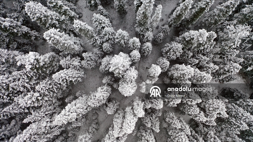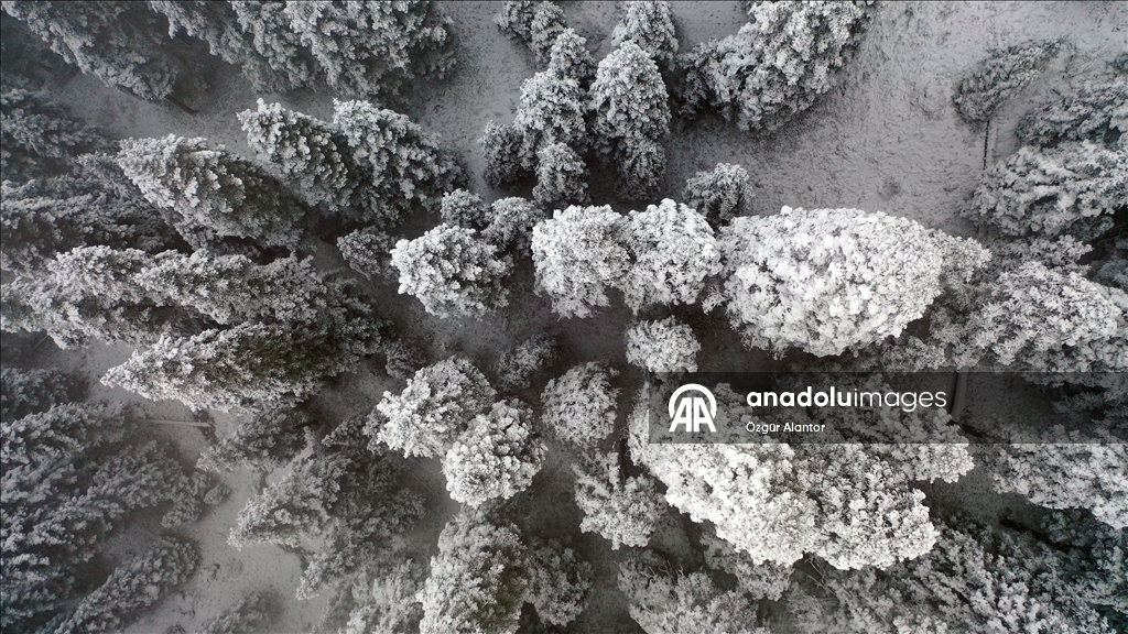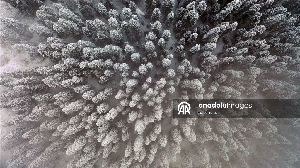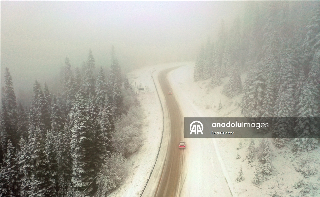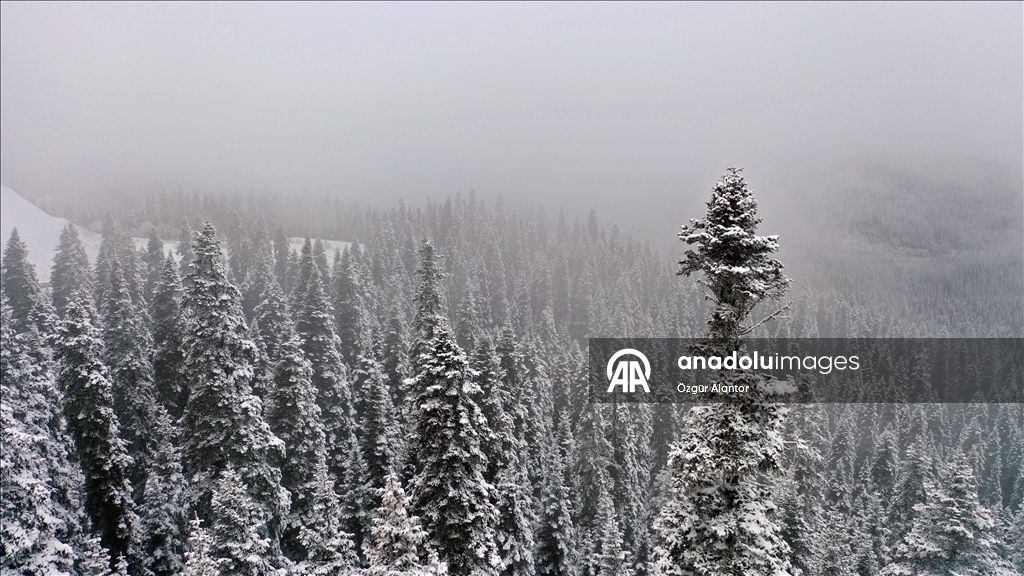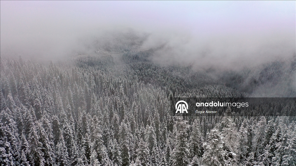 Kastamonu'da Ilgaz Dağı'nda kar ve sis etkili oldu. Güzel görüntü oluşturan ormandaki kar ve sis, dronla görüntülendi.