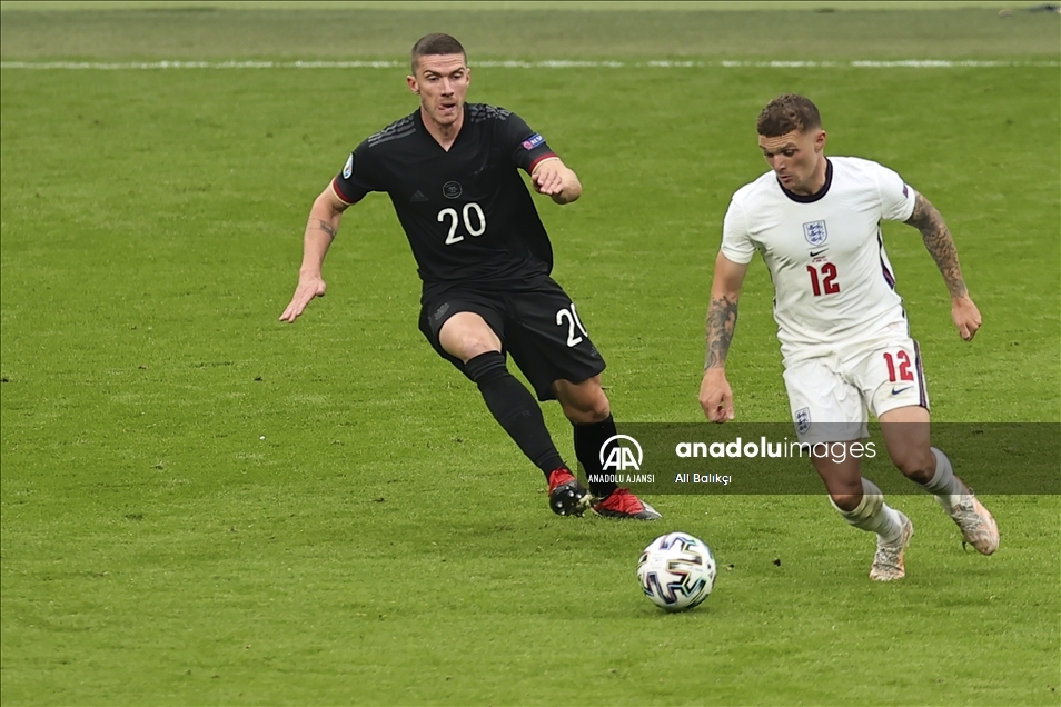 Avrupa Futbol Şampiyonası (EURO 2020) son 16 turunda İngiltere ile Almanya Wembley Stadı'nda karşılaştı. İngiltere Milli takım oyuncusu Kieran Trippier (12) rakibi Robin Gosens (20) ile mücadele etti. ( Ali Balıkçı - Anadolu Ajansı )Ali Balıkçı