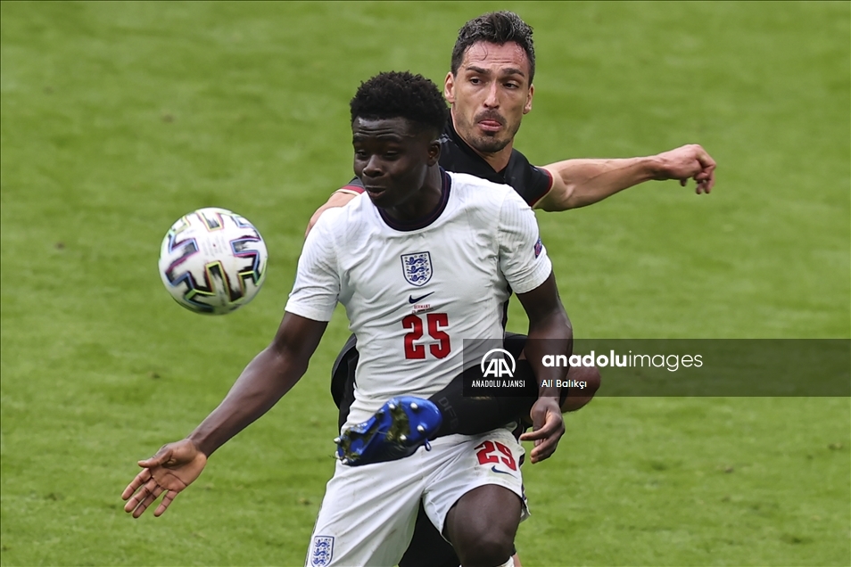 Avrupa Futbol Şampiyonası (EURO 2020) son 16 turunda İngiltere ile Almanya Wembley Stadı'nda karşılaştı. İngiltere Milli takım oyuncusu Bukayo Saka (25) rakibi Mats Hummels (5) ile mücadele etti. ( Ali Balıkçı - Anadolu Ajansı )Ali Balıkçı