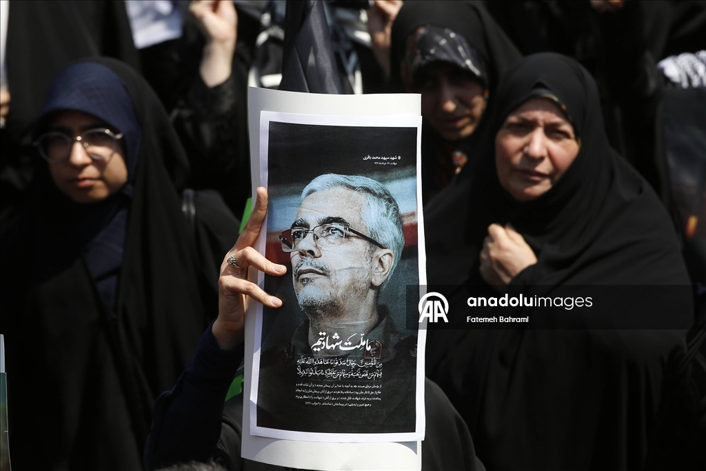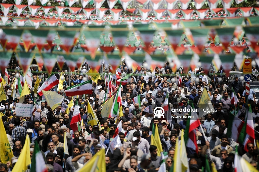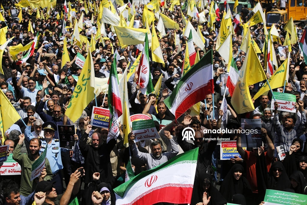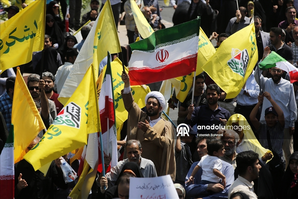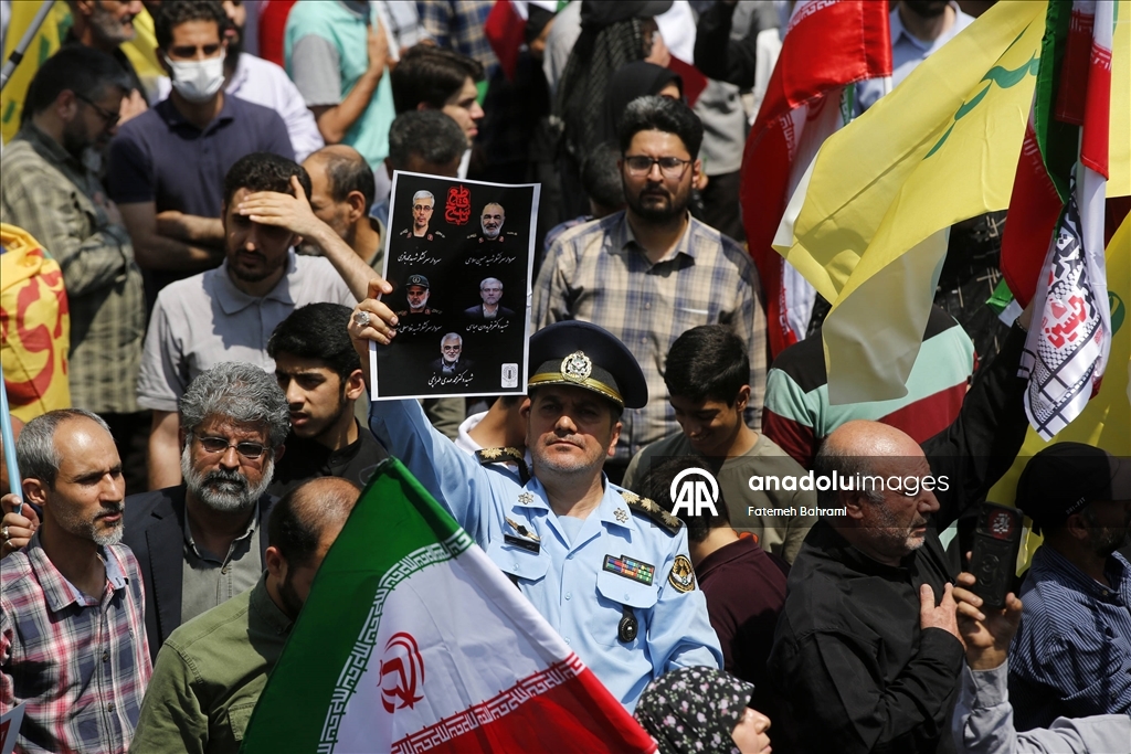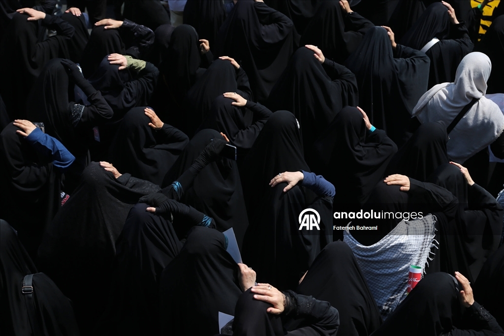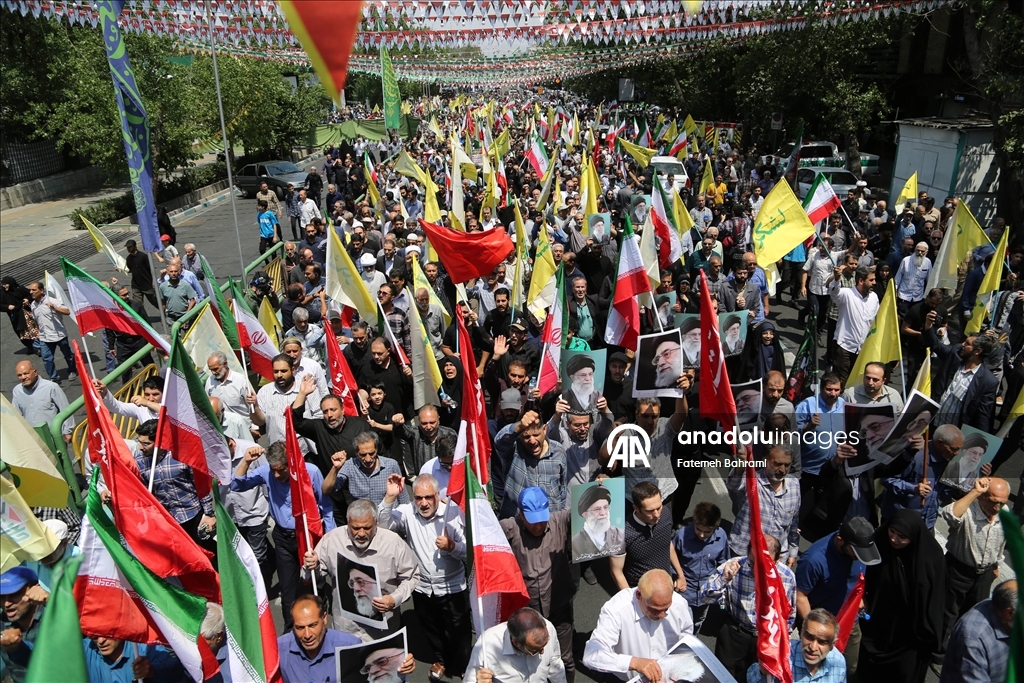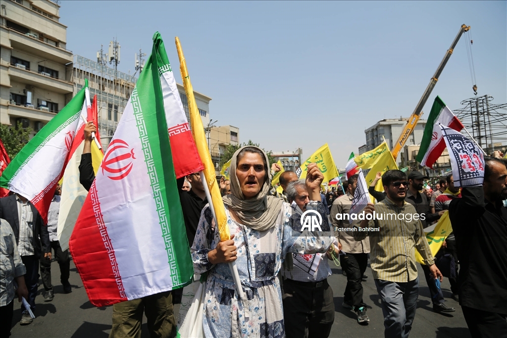 Başkent Tahran'daki İnkılap Meydanı'nda düzenlenen gösteride İran bayrağı taşıyan göstericiler, İsrail ve ABD aleyhine sloganlar attı. (Fatemeh Bahrami - Anadolu Ajansı)Fatemeh Bahrami