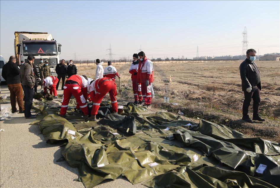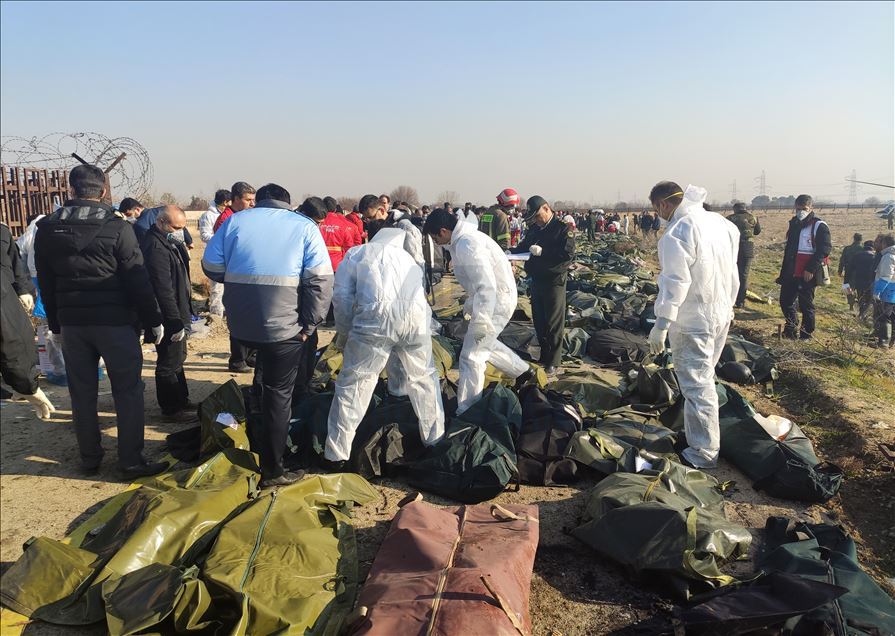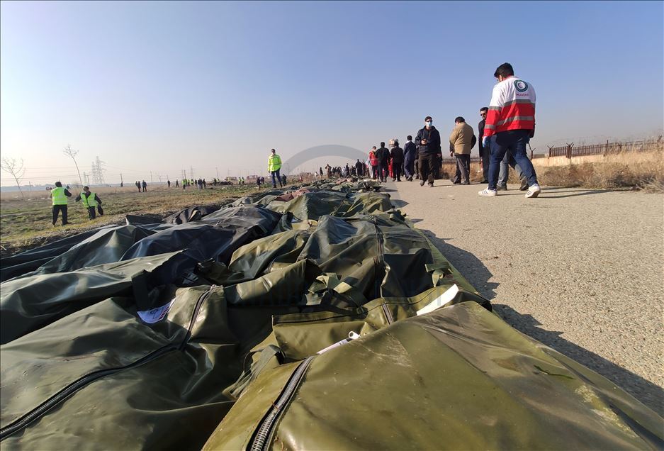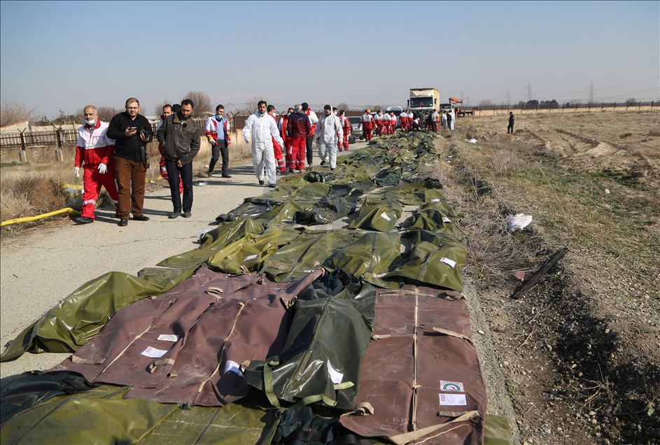 İran'ın başkenti Tahran'da düşen Ukrayna Havayollarına ait Boeing 737 tipi yolcu uçağında bulunan yolcu ve mürettebat 176 kişi hayatını kaybetti. Arama kurtarma ekiplerince, kazada hayatını kaybeden yolcuların cenazeleri bir alanda toplandı. ( Fatemeh Bahrami - Anadolu Ajansı )Fatemeh Bahrami