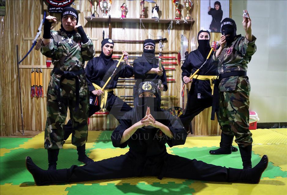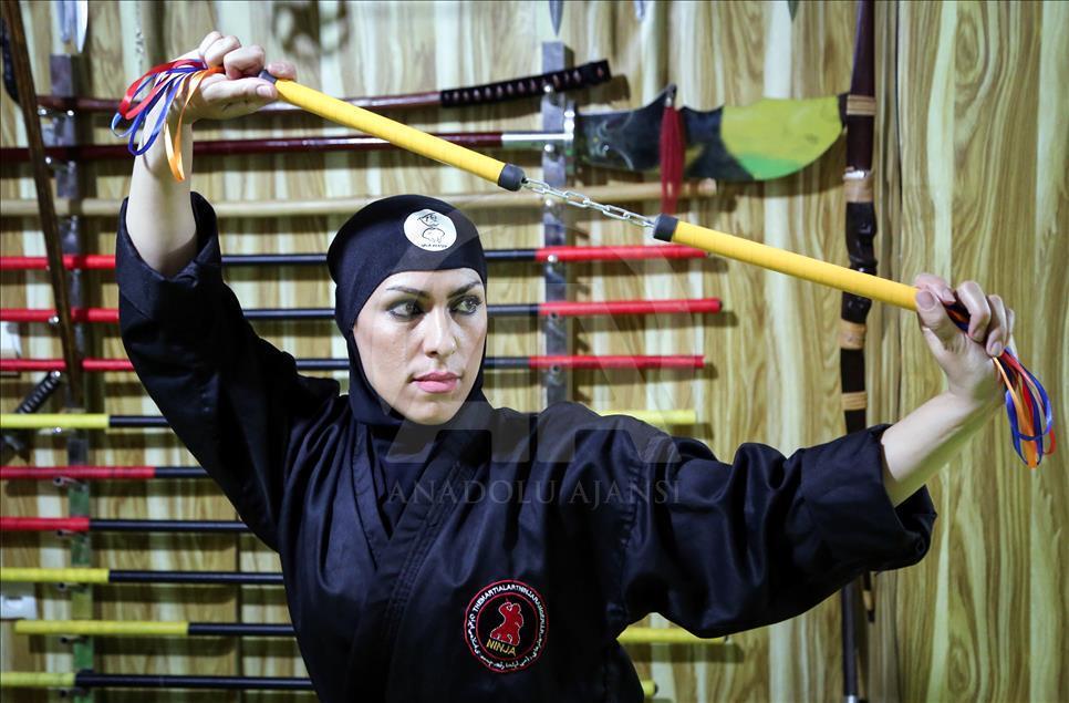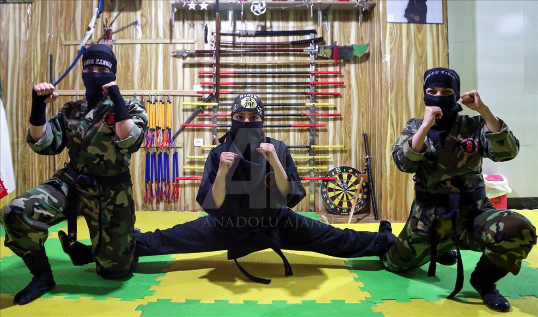 İran'ın başkenti Tahran'daki Refah Spor Salonu'nda kendini savunma maksadıyla ''ninja'' eğitimi alan kadınlar, yakın dövüş ve silah kullanma teknikleri ile ilgili antremanlarını sürdürüyor.