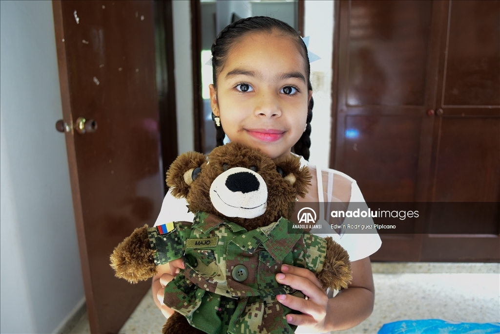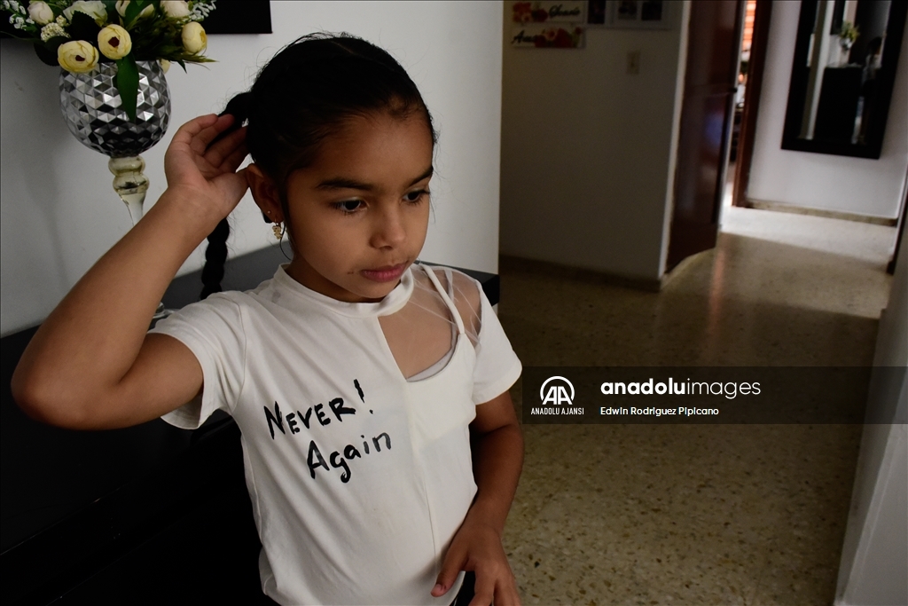 Kolombiya'nin Cali kentinde iki taraflı sensörinöral işitme kaybı olan Maria Jose, modelini annesi Nany Jose'nin (solda) geliştirdiği maske sayesinde, daha rahat iletişim kurabiliyor. Maske günlük yaşamda Maria Jose için temel bir yardımcı haline geldi. Maskedeki dudakları görünür kılan boşluk, işaret dili kullanmayan fakat dudak okuyabilen insanlarla iletişim kurabilmeye yardımcı oluyor. Fotoğrafa Maria, işitme cihazını takarken görülüyor. ( Edwin Rodriguez Pipicano - Anadolu Ajansı )Edwin Rodriguez Pipicano