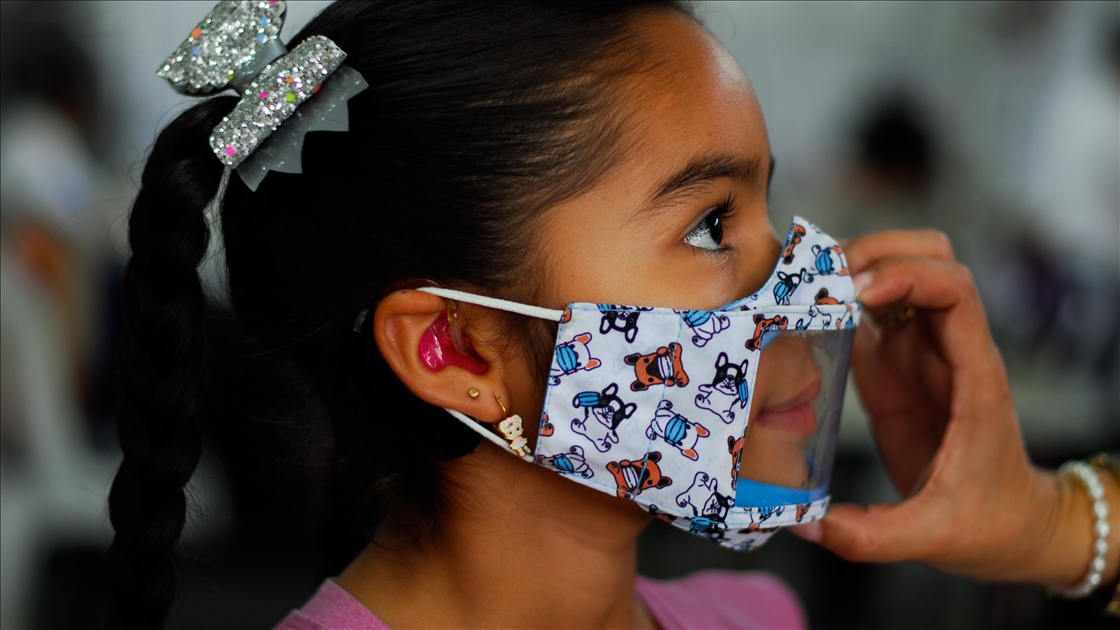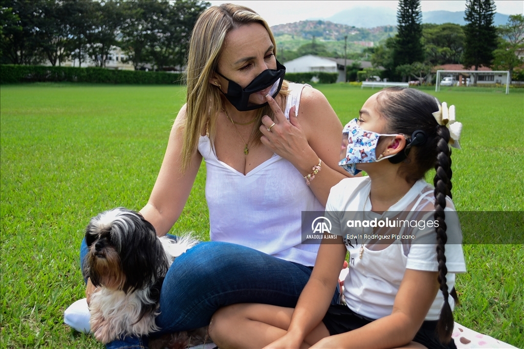 Kolombiya'nin Cali kentinde iki taraflı sensörinöral işitme kaybı olan Maria Jose, modelini annesi Nany Jose'nin geliştirdiği maske sayesinde, daha rahat iletişim kurabiliyor.