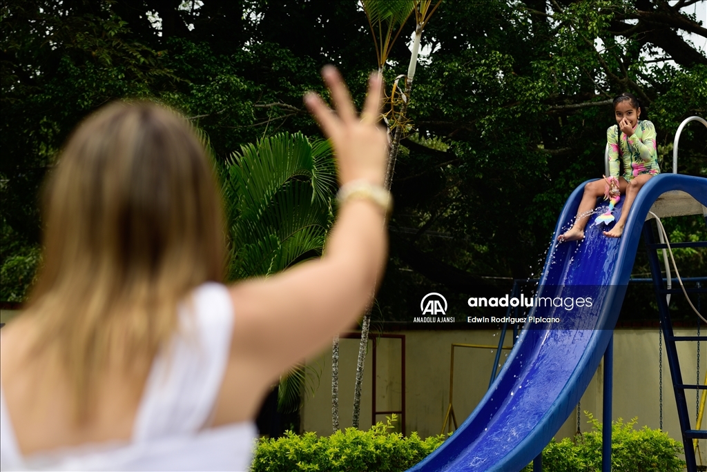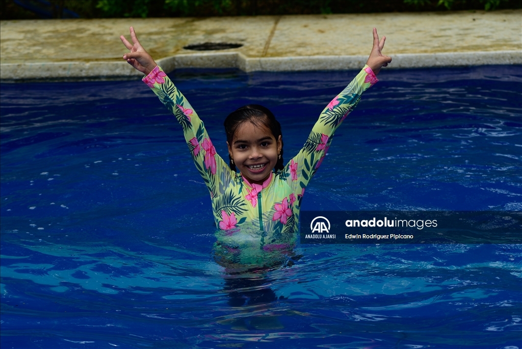 Kolombiya'nin Cali kentinde iki taraflı sensörinöral işitme kaybı olan Maria Jose, modelini annesi Nany Jose'nin (sağda) geliştirdiği maske sayesinde, daha rahat iletişim kurabiliyor. Maske günlük yaşamda Maria Jose için temel bir yardımcı haline geldi. Maskedeki dudakları görünür kılan boşluk, işaret dili kullanmayan fakat dudak okuyabilen insanlarla iletişim kurabilmeye yardımcı oluyor. Fotoğrafta Maria, yüzme eğitiminde görülüyor. ( Edwin Rodriguez Pipicano - Anadolu Ajansı )Edwin Rodriguez Pipicano