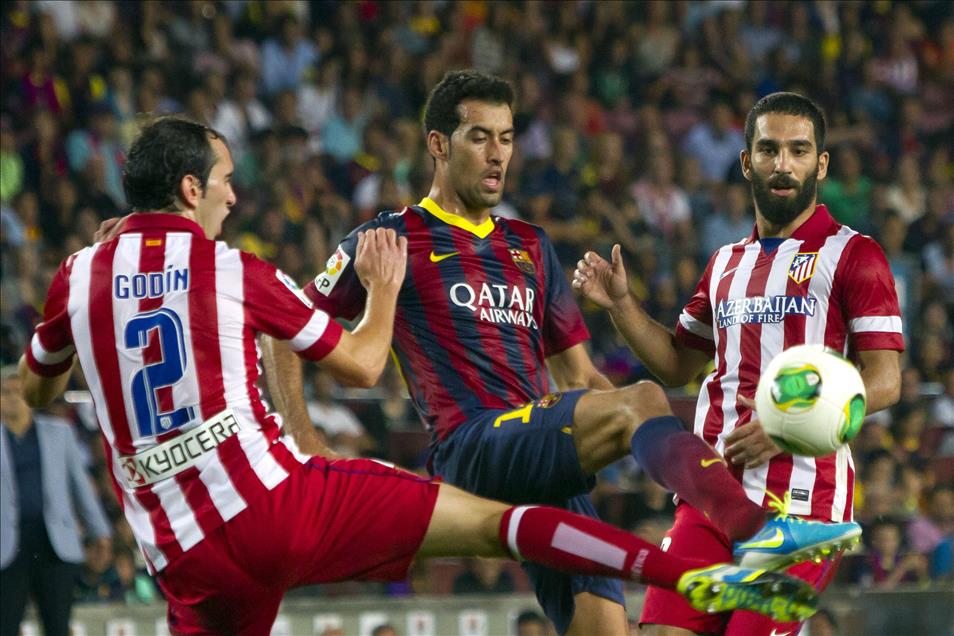 Barcelona, Spain. FC Barcelona's Sergio Busquets fighting with At. Madrid's Godin and Arda during the spanish SuperCopa match against At. de Madrid. Albert Salamé / AnadoluAlbert Salamé / Anadolu