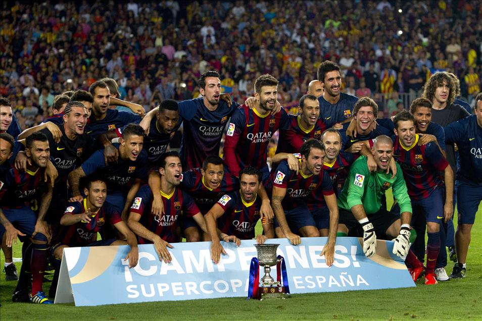 Barcelona, Spain. FC Barcelona's players Pedro Rodriguez and Xavi Hernandez cellebrating the victory of the club at Spanish SuperCup match against At. de Madrid. Albert Salamé / AnadoluAlbert Salamé / Anadolu