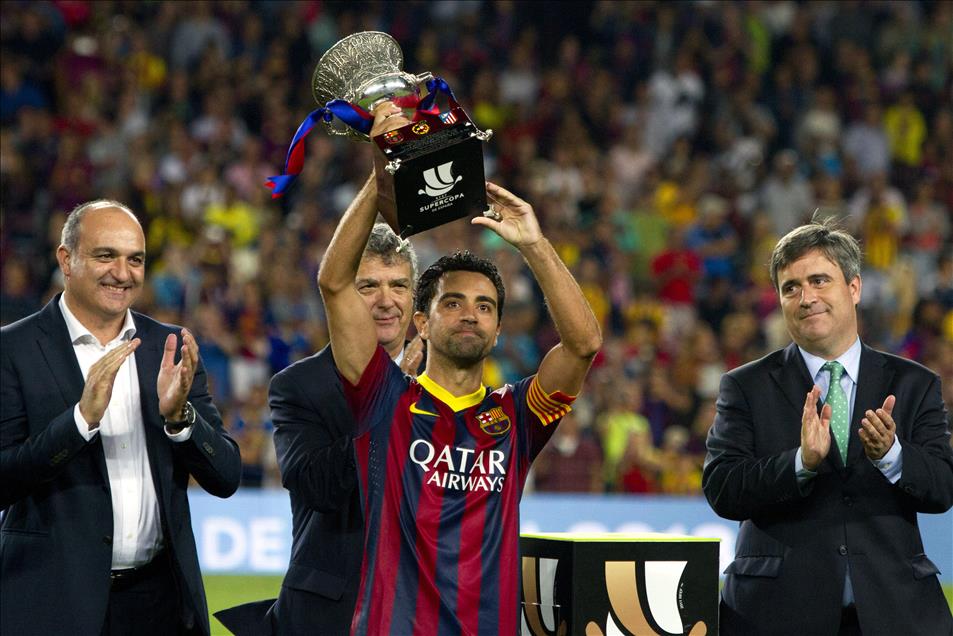 Barcelona, Spain. FC Barcelona's captains Xavi hernandez cellebrates the victory of the club at Spanish SuperCup match against At. de Madrid. Albert Salamé / AnadoluAlbert Salamé / Anadolu