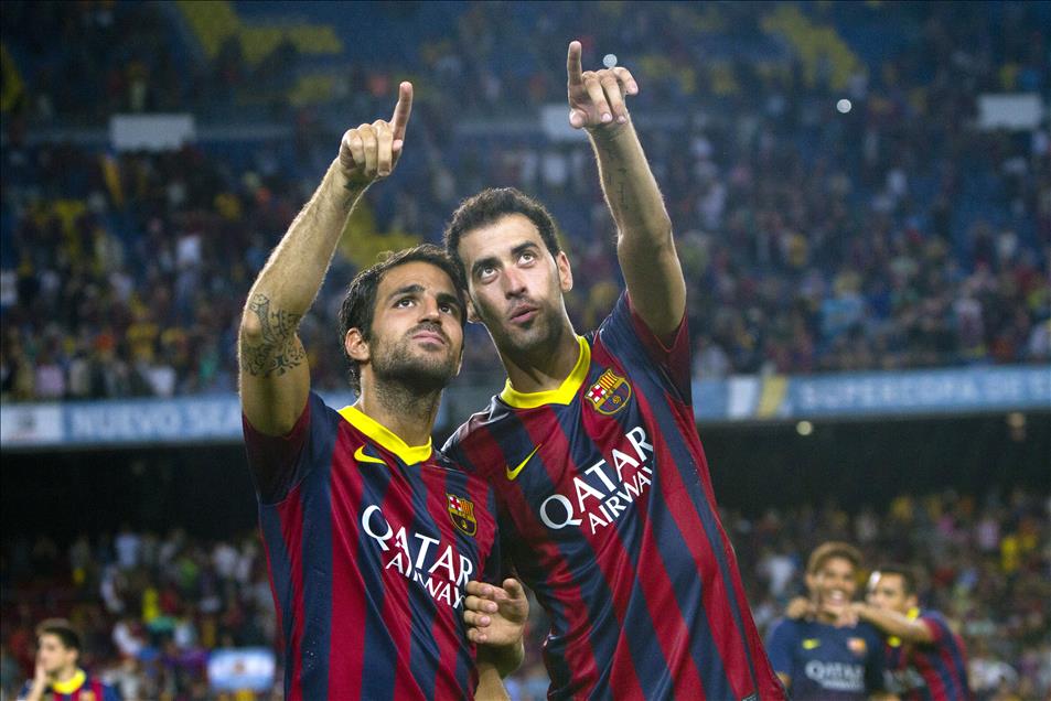 Barcelona, Spain. FC Barcelona's players Cesc Fabregas and Sergio Busquets cellebrating the victory of the club at Spanish SuperCup match against At. de Madrid. Albert Salamé / AnadoluAlbert Salamé / Anadolu