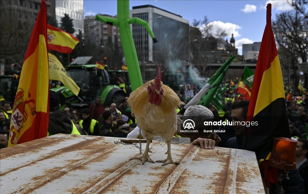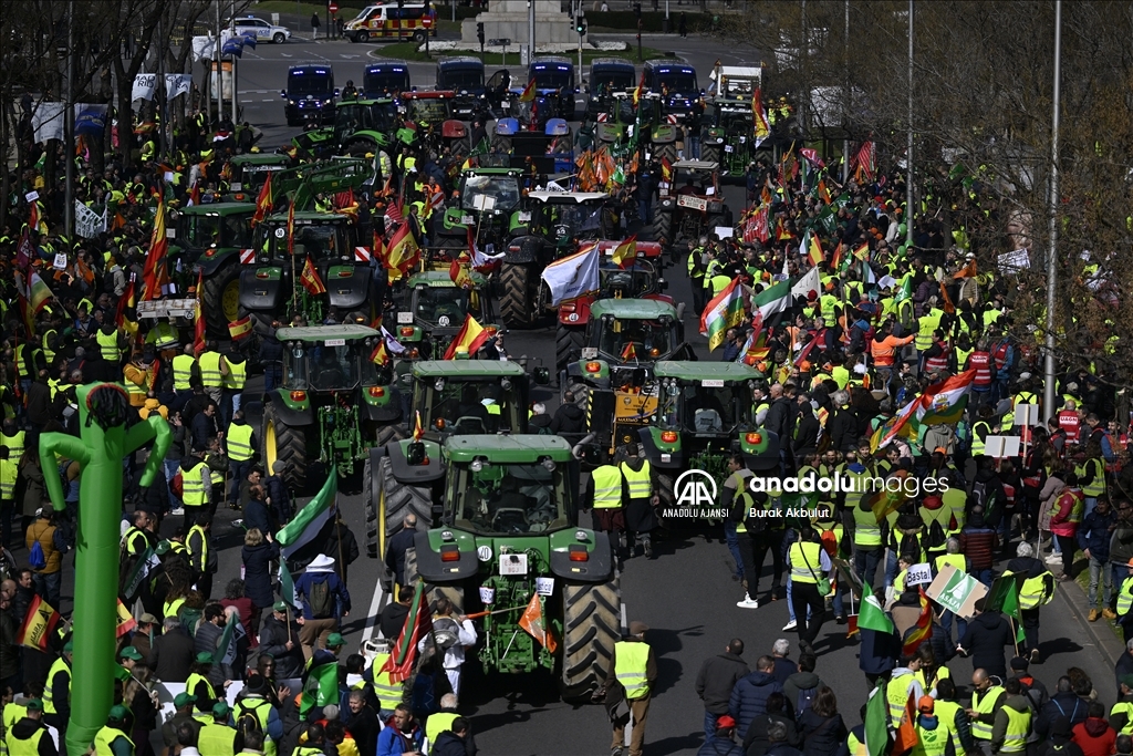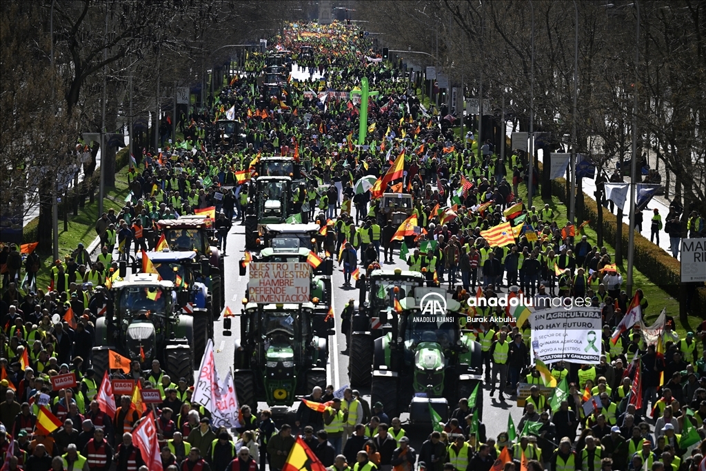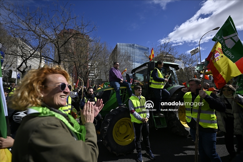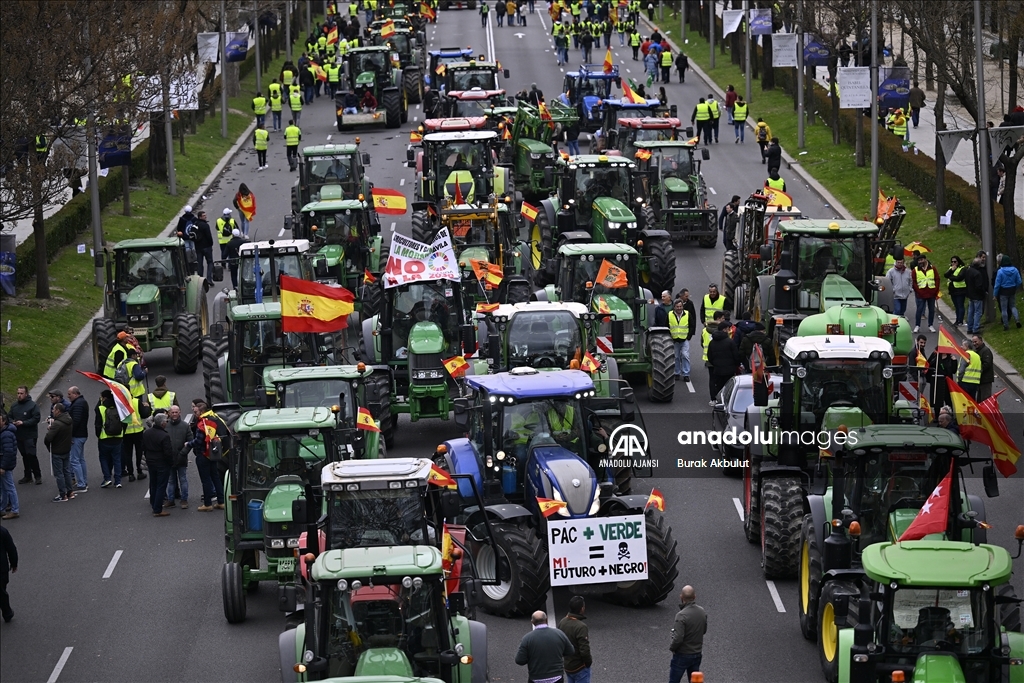 İspanyol çiftçiler ve hayvan yetiştiricileri, üçüncü haftasına giren eylemlerinde traktörlerini bu kez başkent Madrid'deki Avrupa Parlamentosu (AP) binasının önüne sürdü. Çiftçilerin bağlı olduğu üç büyük sendika, Asaja, COAG ve UPA, Brüksel'de bu hafta yapılacak ve AB Ortak Tarım Politikası ile ilgili bazı kararların alınmasının beklendiği toplantı ve yarınki Bakanlar Kurulu'nda hükümetin alması öngörülen sektörle bağlantı kararlardan dolayı protestolarını başkent Madrid'de yoğunlaştırdı. Tarım, Gıda ve Balıkçılık Bakanlığı binası önünden traktörleriyle ve yürüyerek protestolarına başlayan yaklaşık 2 bin çiftçi, kent merkezinde trafiği yavaşlatarak seslerini duyurma eylemlerini AP binası önünde sonlandırdı. ( Burak Akbulut - Anadolu Ajansı )Burak Akbulut