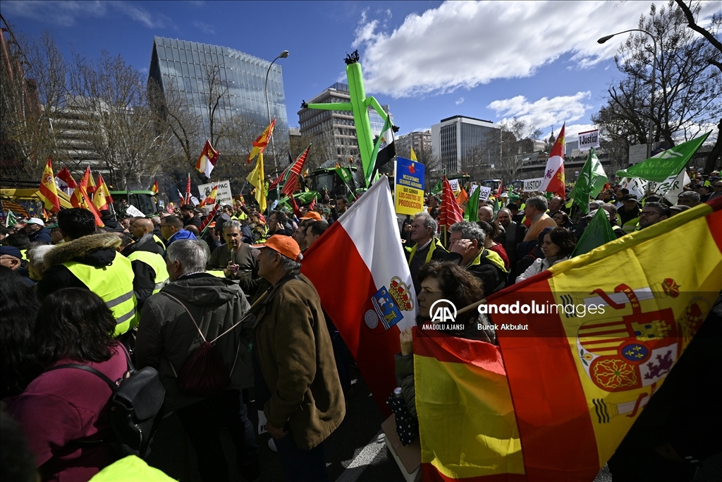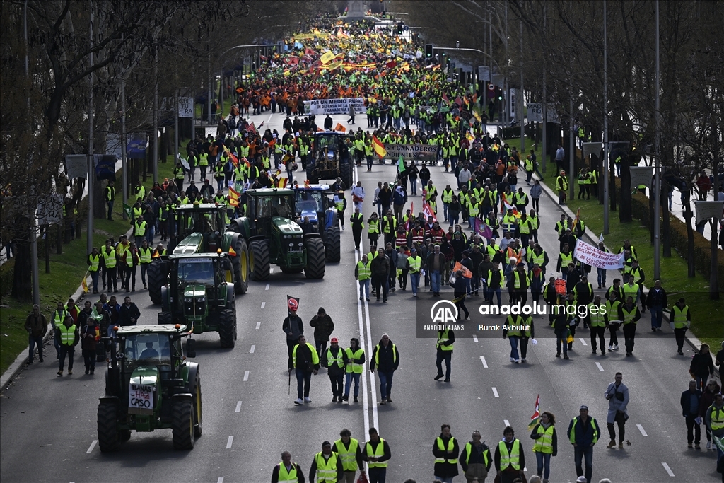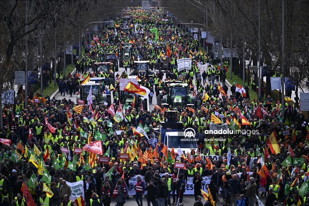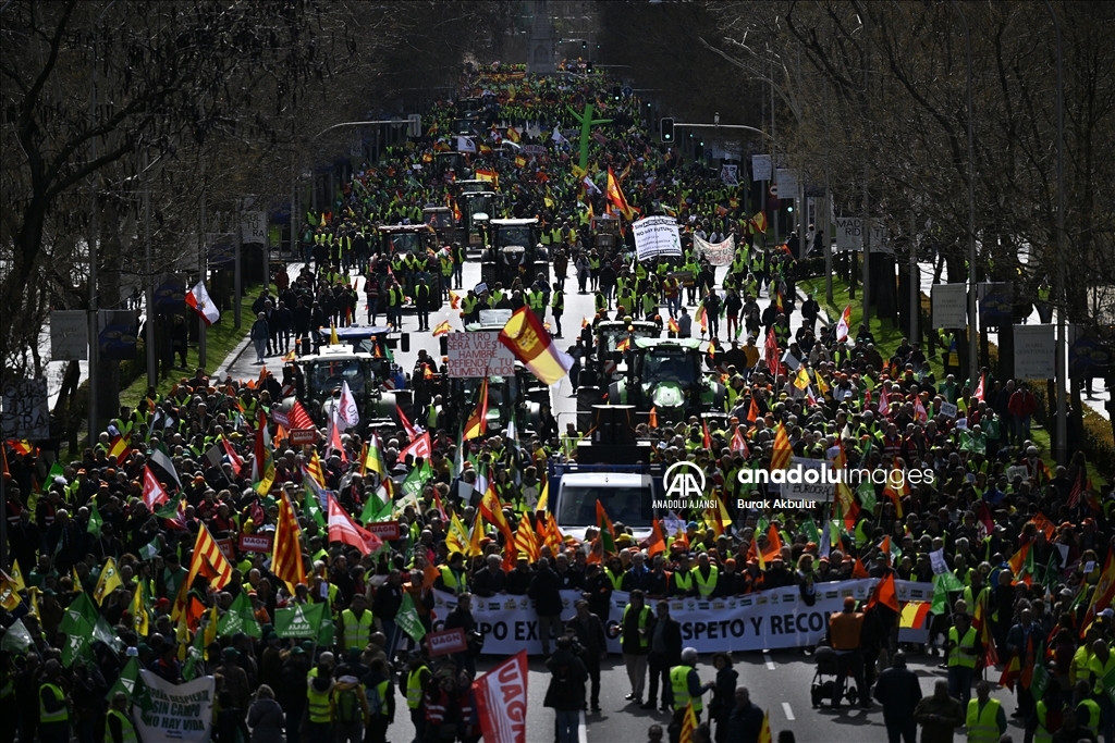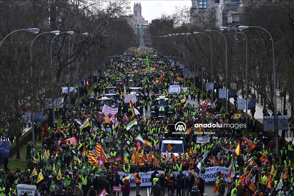 İspanyol çiftçiler ve hayvan yetiştiricileri, üçüncü haftasına giren eylemlerinde traktörlerini bu kez başkent Madrid'deki Avrupa Parlamentosu (AP) binasının önüne sürdü. Çiftçilerin bağlı olduğu üç büyük sendika, Asaja, COAG ve UPA, Brüksel'de bu hafta yapılacak ve AB Ortak Tarım Politikası ile ilgili bazı kararların alınmasının beklendiği toplantı ve yarınki Bakanlar Kurulu'nda hükümetin alması öngörülen sektörle bağlantı kararlardan dolayı protestolarını başkent Madrid'de yoğunlaştırdı. Tarım, Gıda ve Balıkçılık Bakanlığı binası önünden traktörleriyle ve yürüyerek protestolarına başlayan yaklaşık 2 bin çiftçi, kent merkezinde trafiği yavaşlatarak seslerini duyurma eylemlerini AP binası önünde sonlandırdı. ( Burak Akbulut - Anadolu Ajansı )Burak Akbulut
