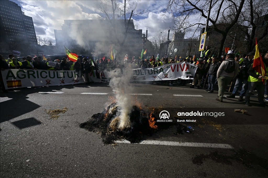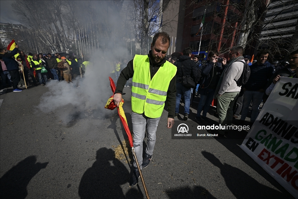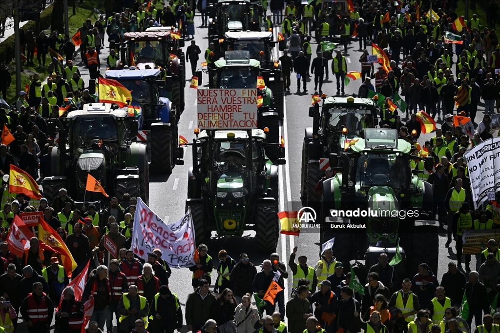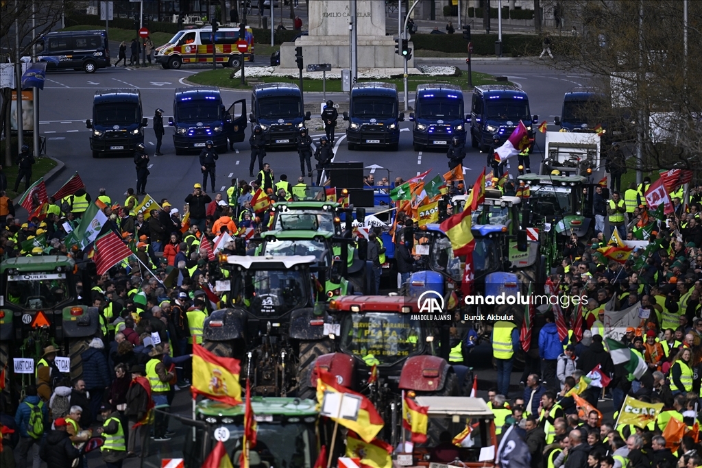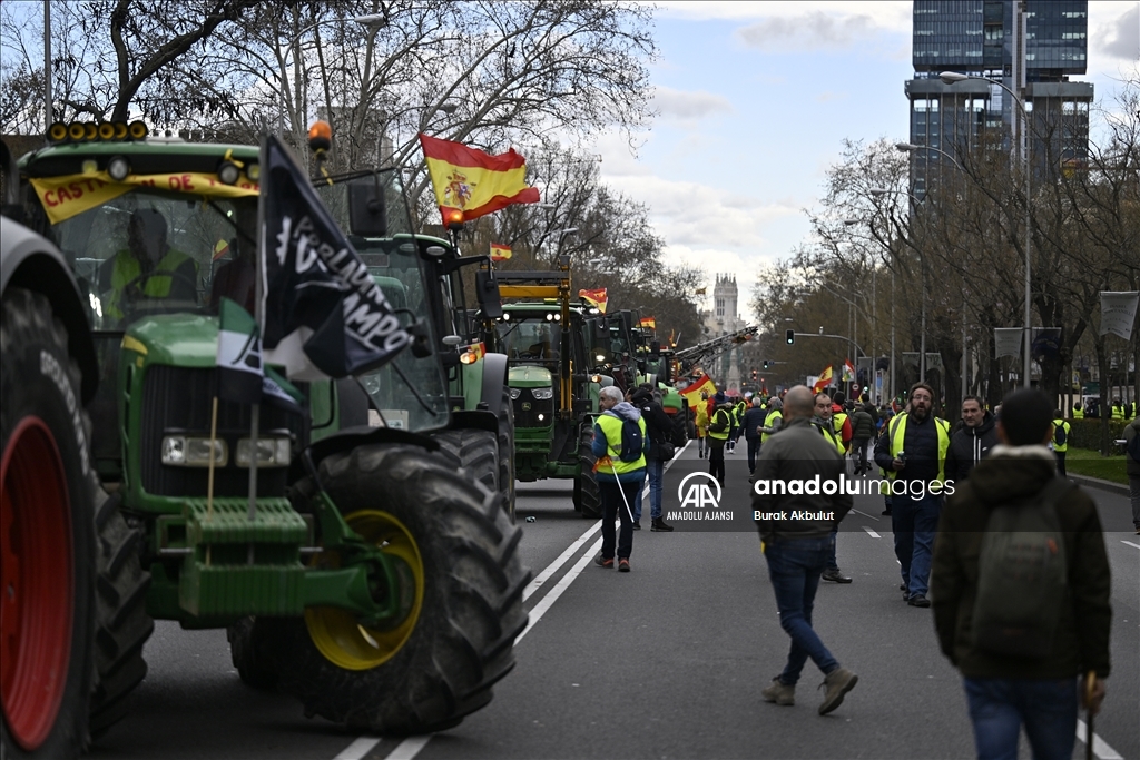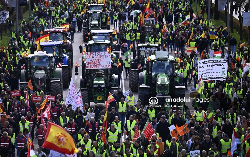 İspanyol çiftçiler ve hayvan yetiştiricileri, üçüncü haftasına giren eylemlerinde traktörlerini bu kez başkent Madrid'deki Avrupa Parlamentosu (AP) binasının önüne sürdü.