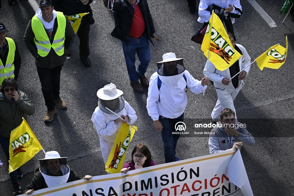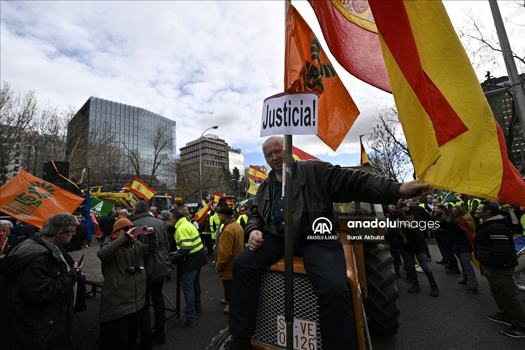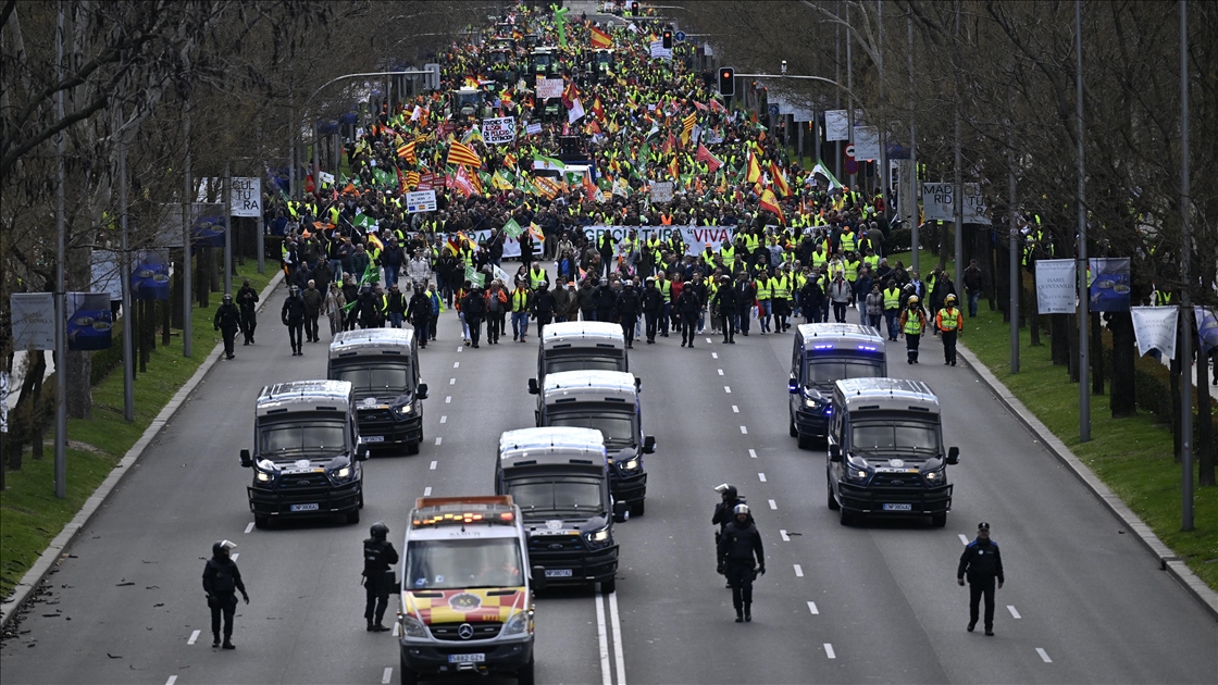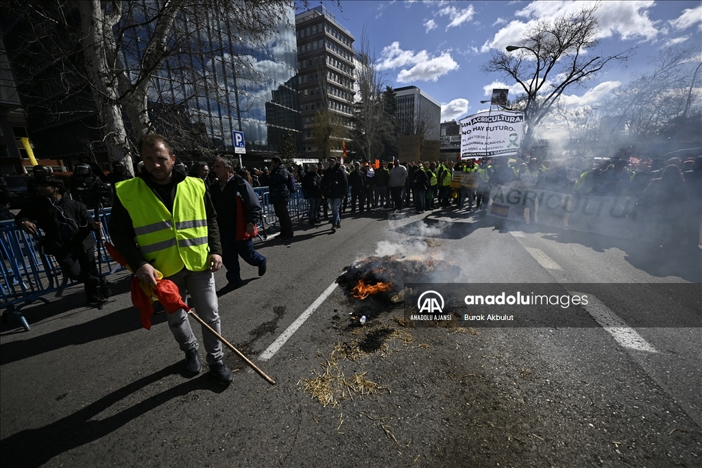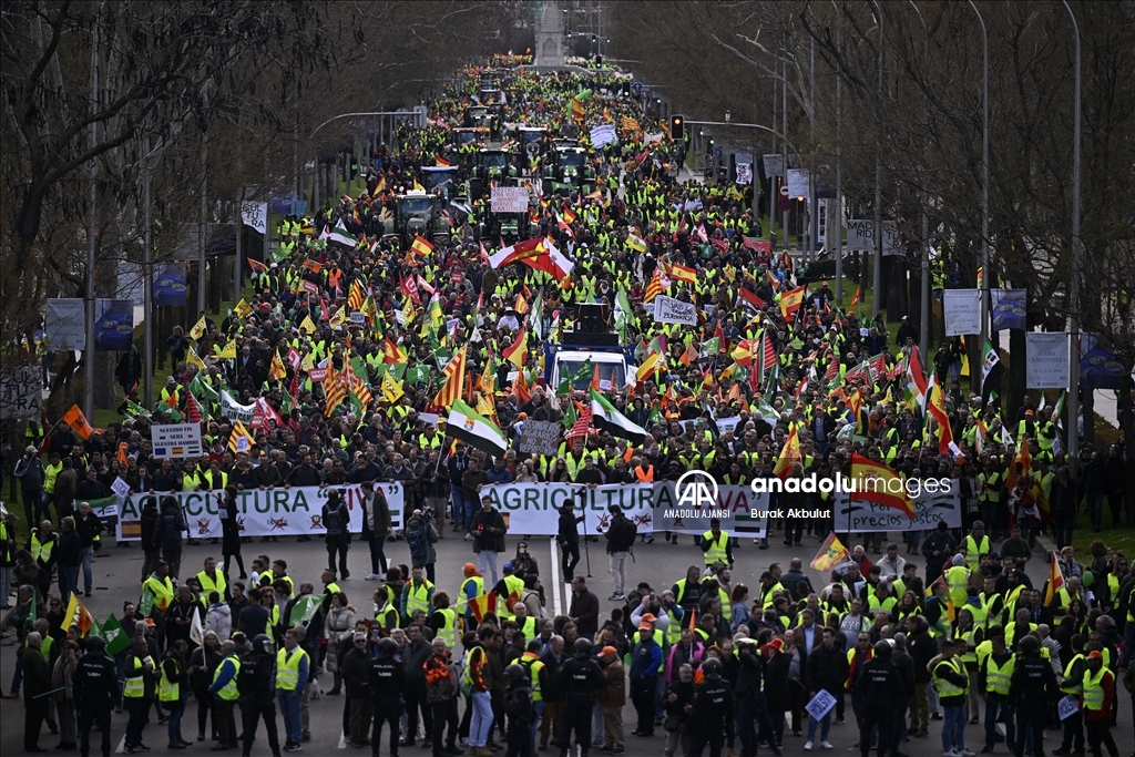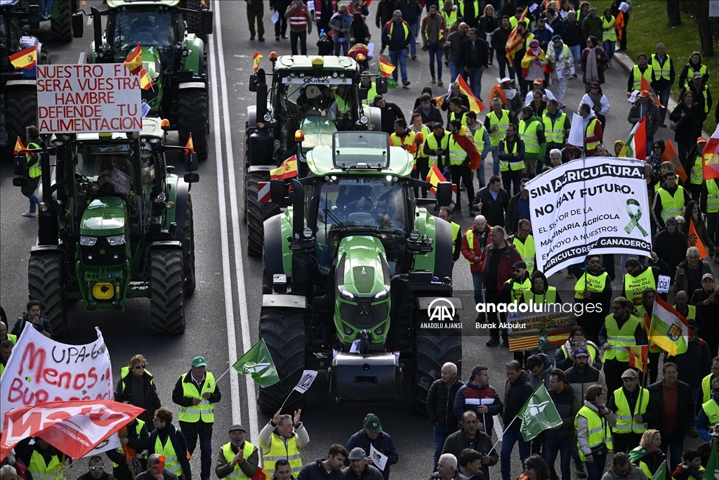 İspanyol çiftçiler ve hayvan yetiştiricileri, üçüncü haftasına giren eylemlerinde traktörlerini bu kez başkent Madrid'deki Avrupa Parlamentosu (AP) binasının önüne sürdü.