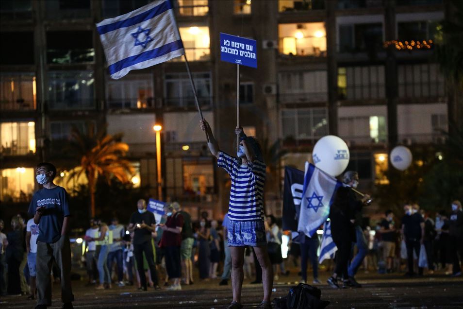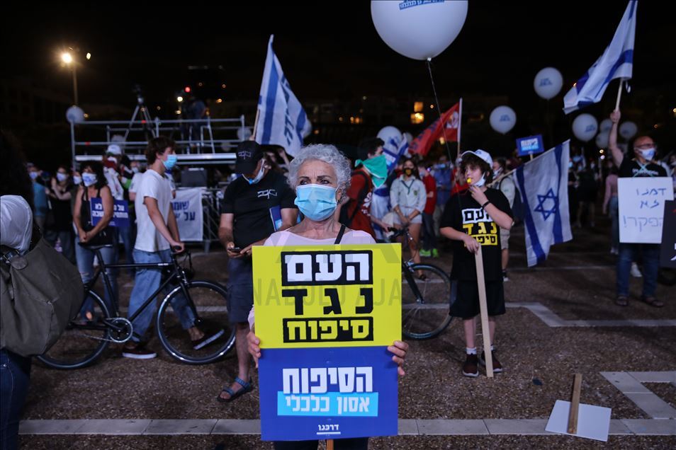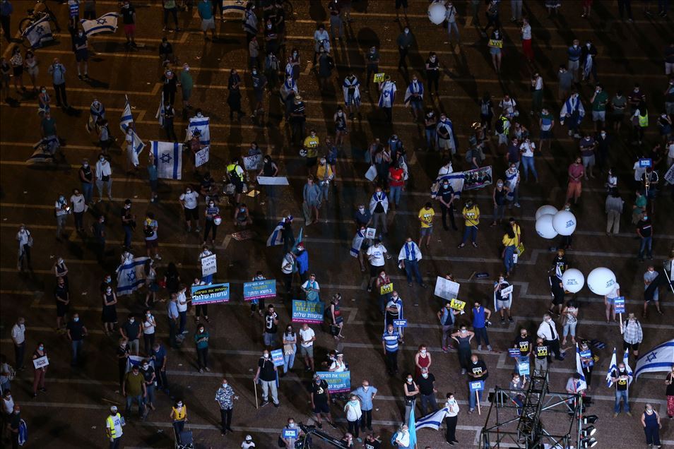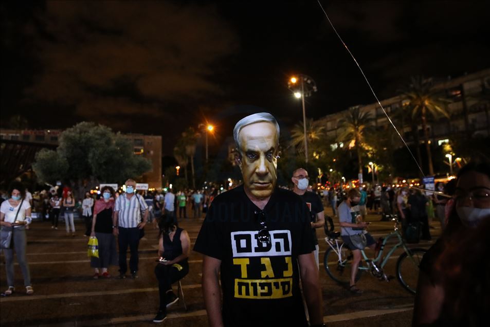 İsrail yönetiminin işgal altındaki Batı Şeria'da yer alan yasa dışı Yahudi yerleşim birimleri ve Ürdün Vadisi'ni "ilhak" planını protesto etmek için Tel Aviv'de gösteri düzenlendi. İsrail bayrakları açan protestoculardan bazıları, İsrail Başbakanı Binyamin Netanyahu'yu kastederek üzerinde "suç başbakanı" yazılı maske taktı. ( Mostafa Alkharouf - Anadolu Ajansı )Mostafa Alkharouf