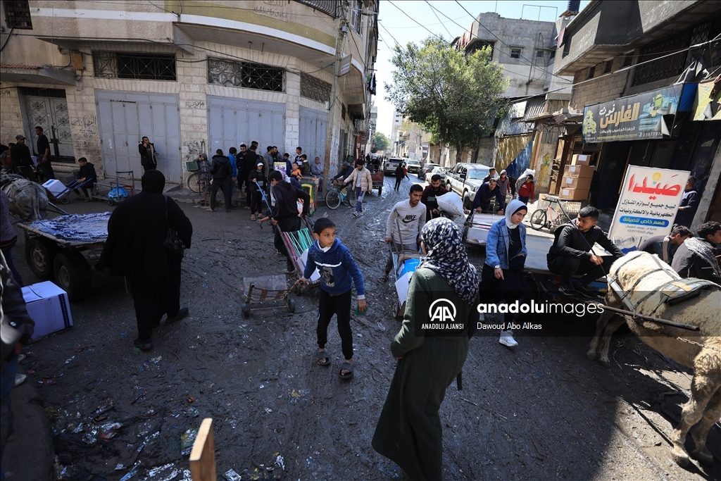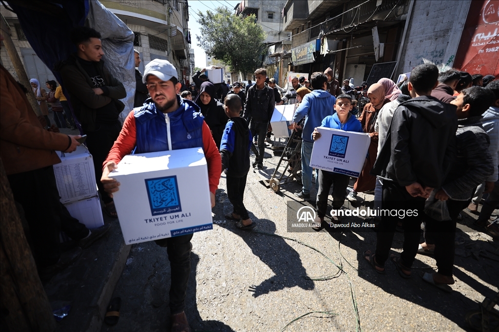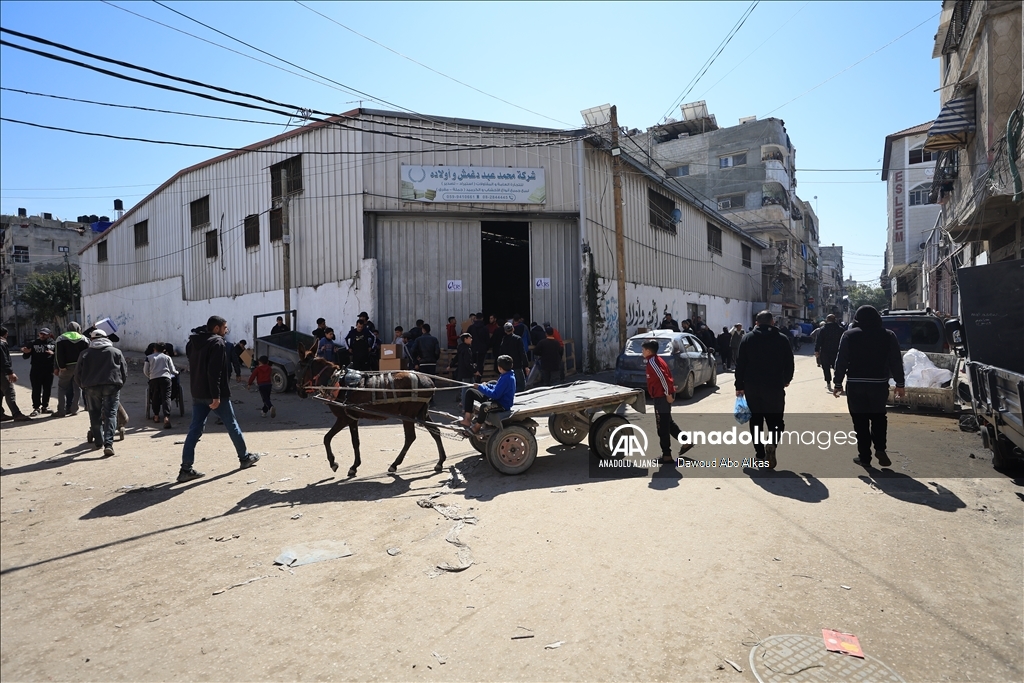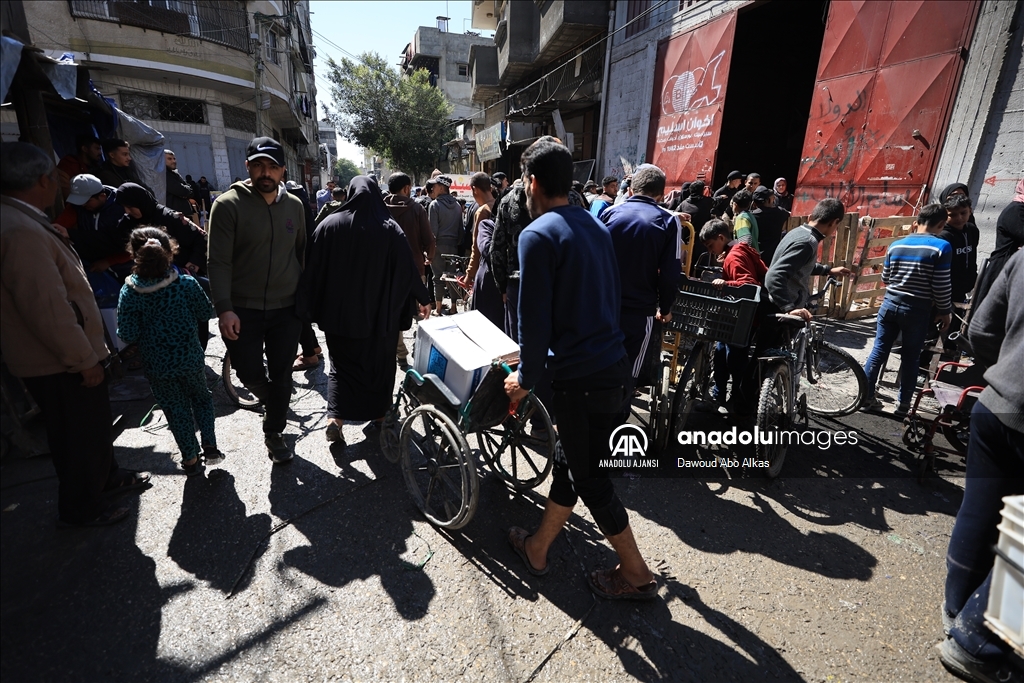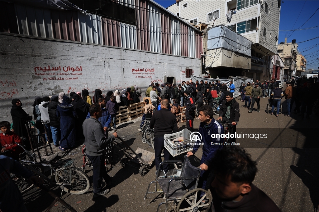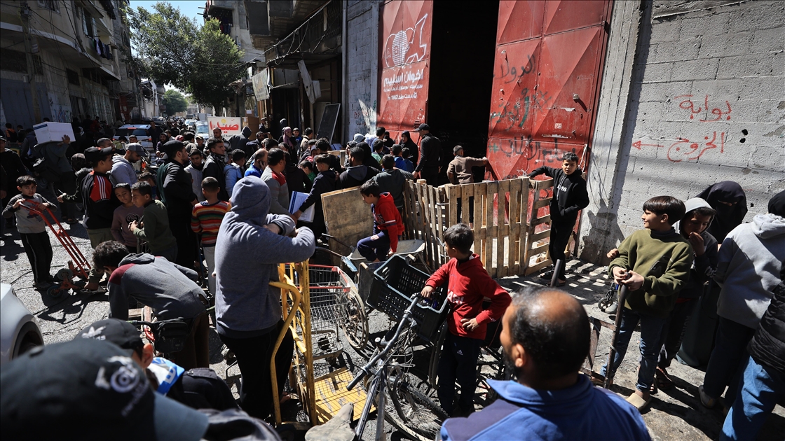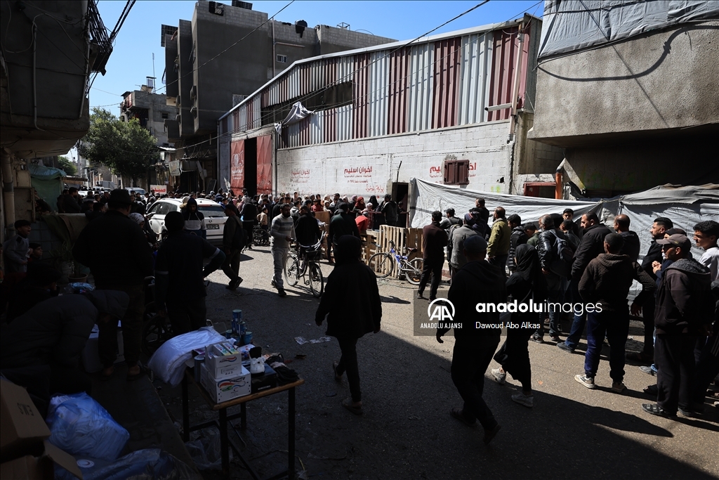 İnsani yardımların girişinin durmasının ardından Filistinliler, Gazze kentindeki yardım dağıtım merkezleri önünde yardım alabilmek için uzun kuyruklar oluşturdu. (Dawoud Abo Alkas - Anadolu Ajansı)Dawoud Abo Alkas