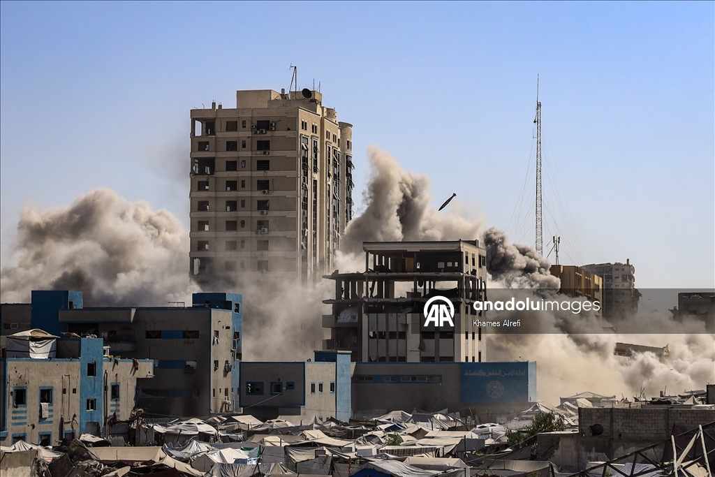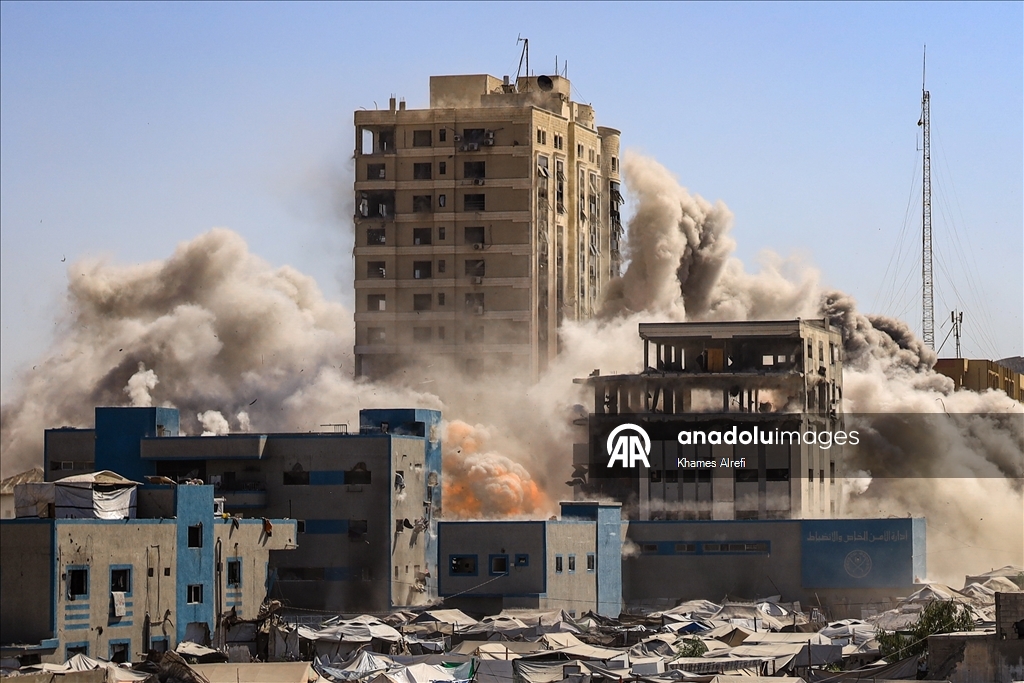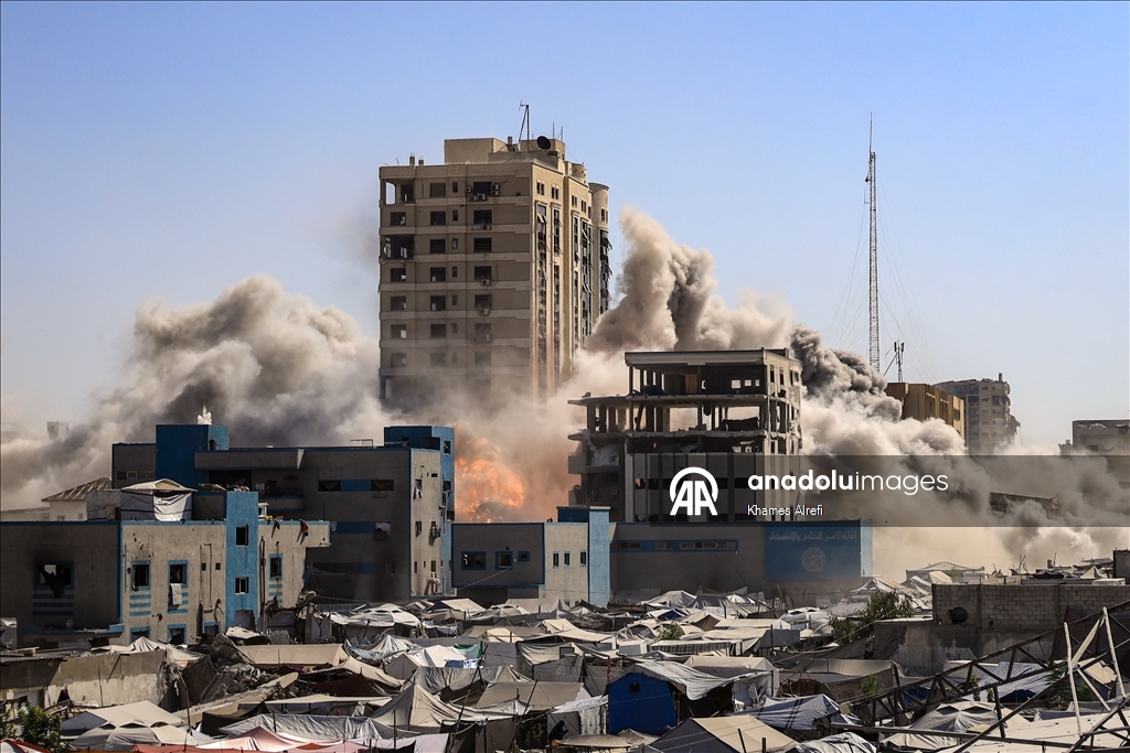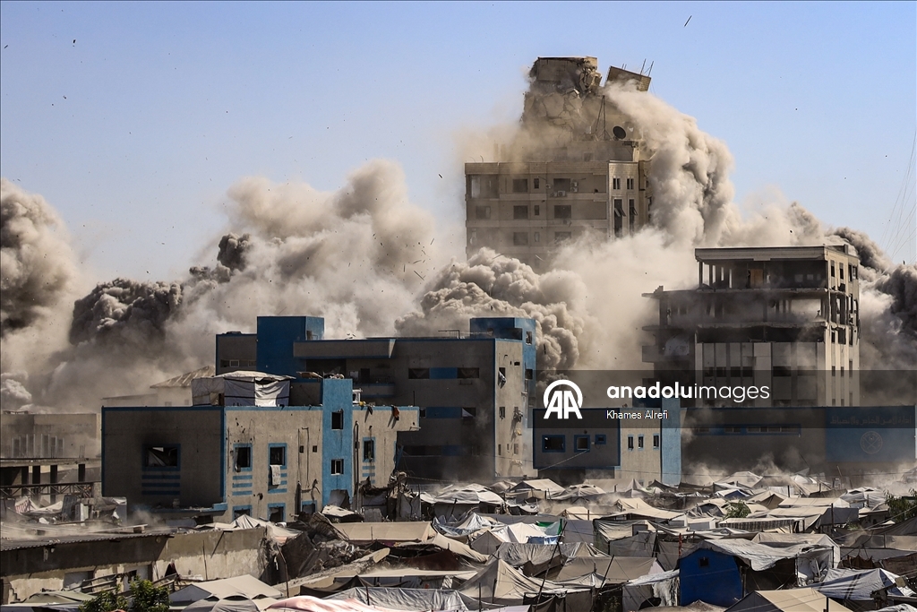 İsrail ordusu, Gazze kentinde “Al-Roya Kulesi” adıyla bilinen 7 katlı binayı hava saldırısıyla hedef aldı. Saldırıda kule tamamen yıkılırken, en az bir kişi hayatını kaybetti, çok sayıda kişi de yaralandı. Saldırı sonrası bölgeden dumanlar yükseldi. ( Khames Alrefi - Anadolu Ajansı )Khames Alrefi