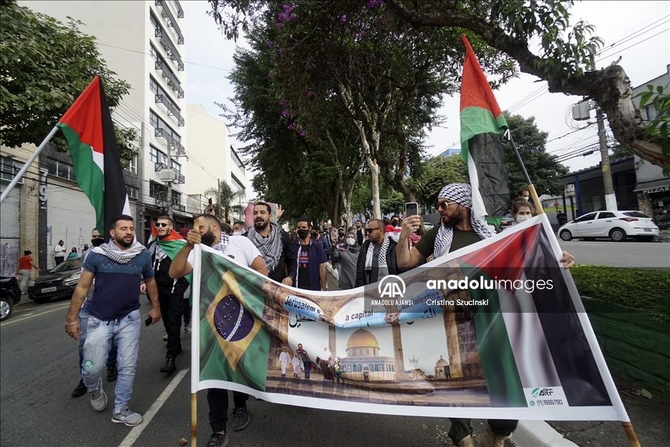 Brezilya'nın Sao Paulo kentinde bir araya gelen göstericiler Filistin'e destek vermek ve İsrail'in Doğu Kudüs ve Gazze'deki saldırılarını protesto etmek için Bela Vista bölgesinde toplanarak Pacaembu Stadyumu çevresine kadar yürüdü. ( Cristina Szucinski - Anadolu Ajansı )Cristina Szucinski