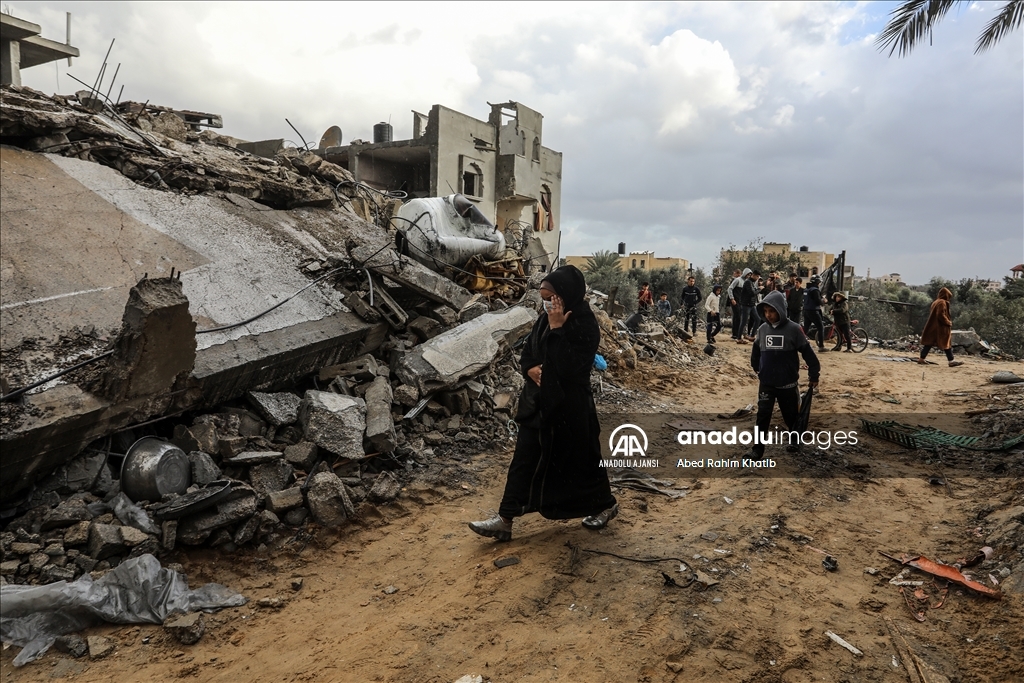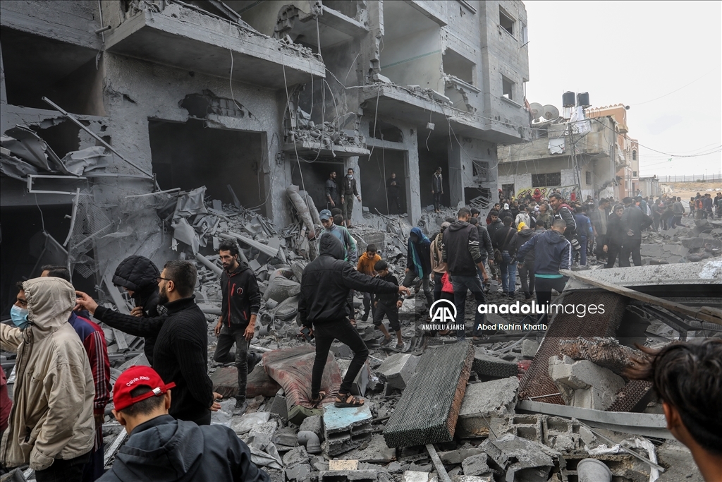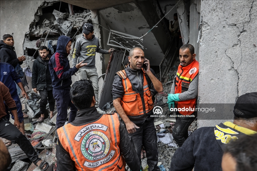 İsrail ordusunun Gazze Şeridi'ne devam eden saldırıları 45. gününde de artarak sürüyor. Gazze'nin Refah kentindeki Ebu Rabea ailesine ait bir binaya düzenlenen saldırı sonucu ölü ve yaralıların olduğu bildirildi. Sivil savunma ekipleri ve bölge halkı, yıkılan binanın enkazında arama kurtarma çalışması yaptı. ( Abed Rahim Khatib - Anadolu Ajansı )Abed Rahim Khatib