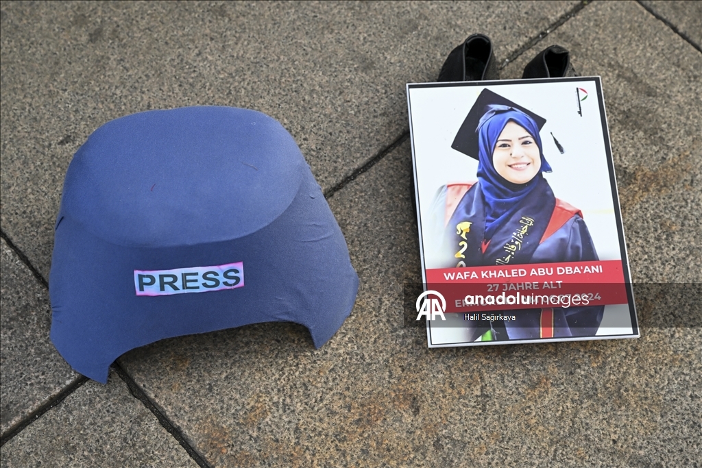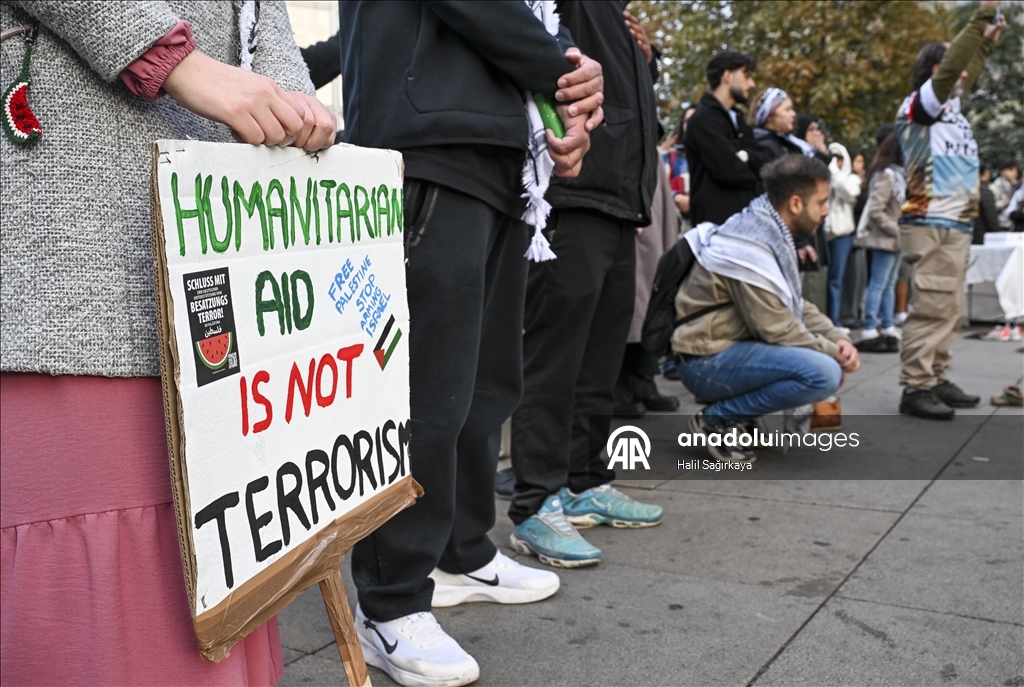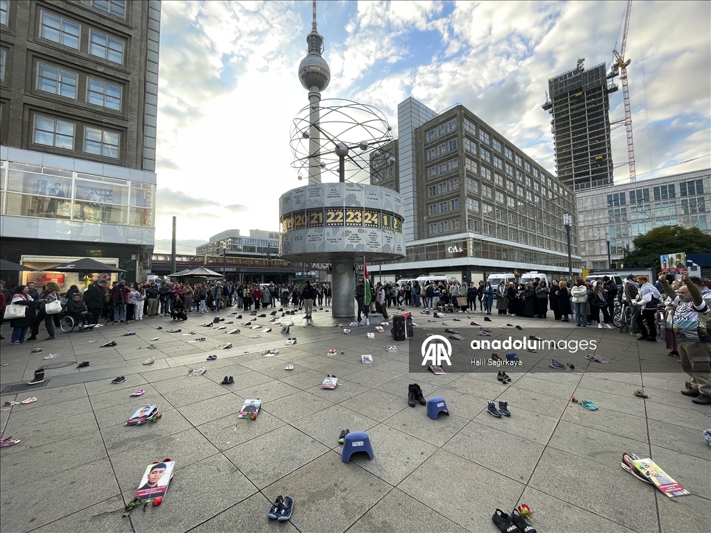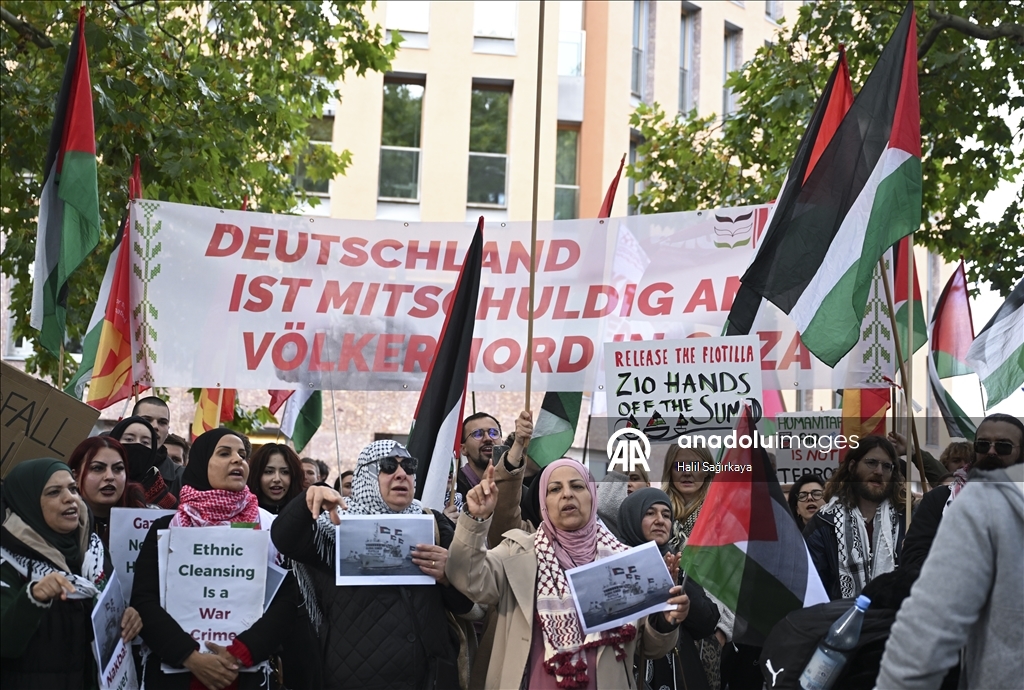 Almanya’nın başkenti Berlin’deki Dışişleri Bakanlığı önünde, Küresel Sumud Filosu’na destek amacıyla gösteri düzenlendi. Çeşitli pankartlar pankart ve dövizler göstericiler, Filistin’ destek veren sloganlar attı. (Halil Sağırkaya - Anadolu Ajansı)Halil Sağırkaya