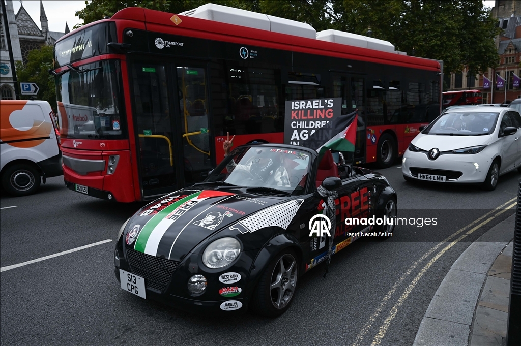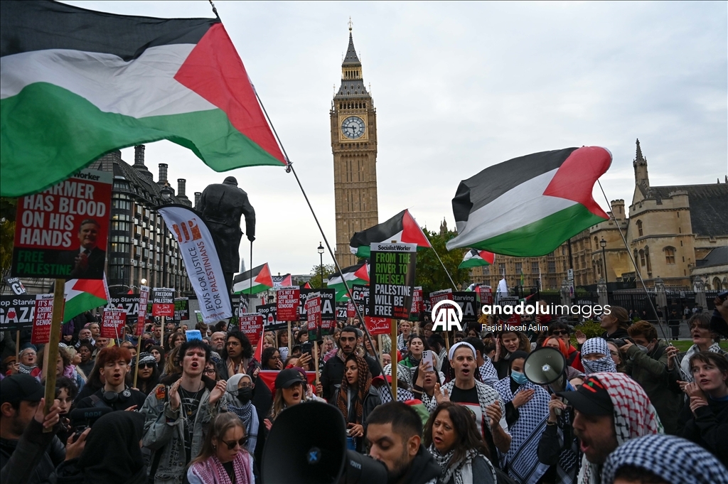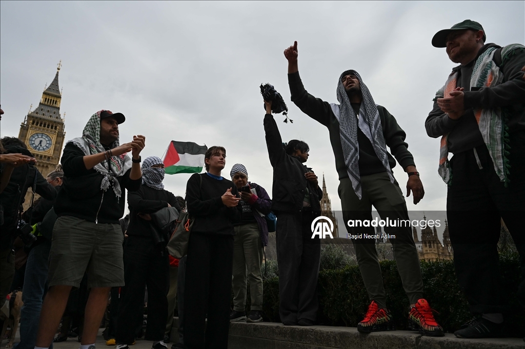 İngiltere’nin başkenti Londra’da Parlamento Meydanı’nda toplanan göstericiler, Gazze’ye yönelik ablukaya son verilmesi ve İsrail’e silah satışlarının durdurulması çağrısında bulundu. Filistin bayrakları taşıyan kalabalık daha sonra Downing Street'e yürüdü. (Raşid Necati Aslım - Anadolu Ajansı)Raşid Necati Aslım