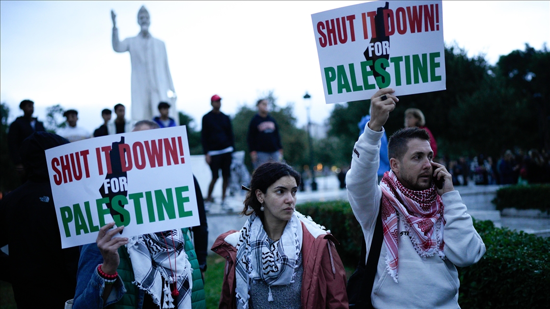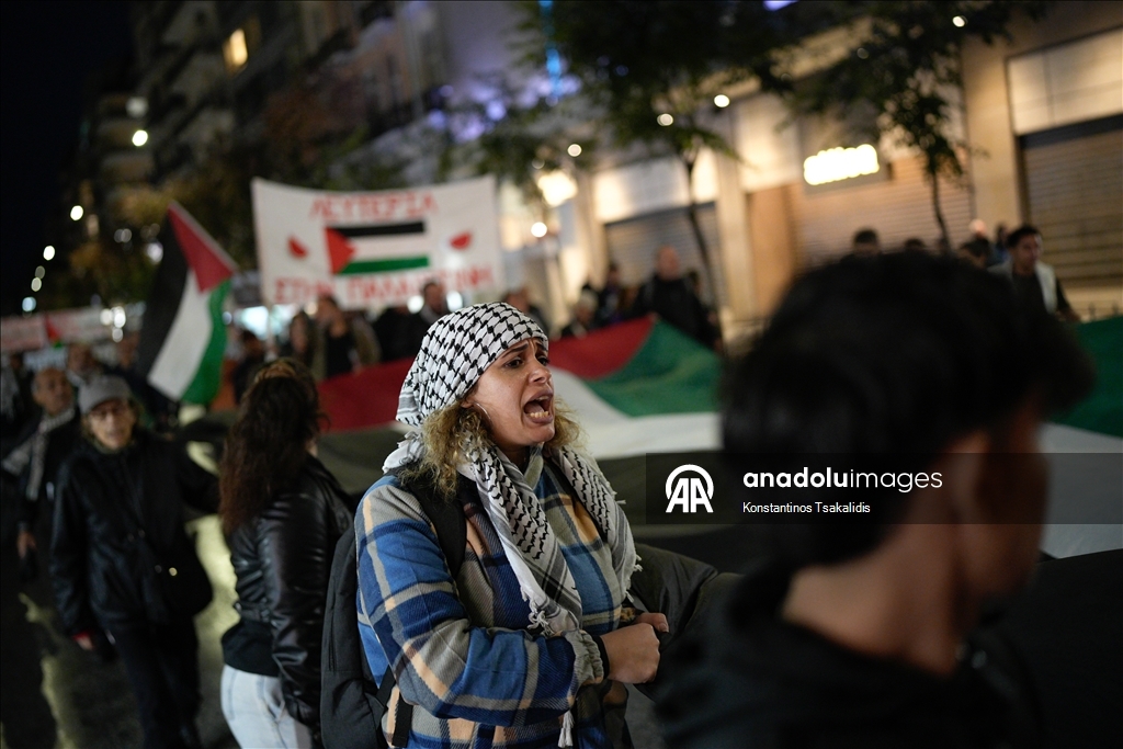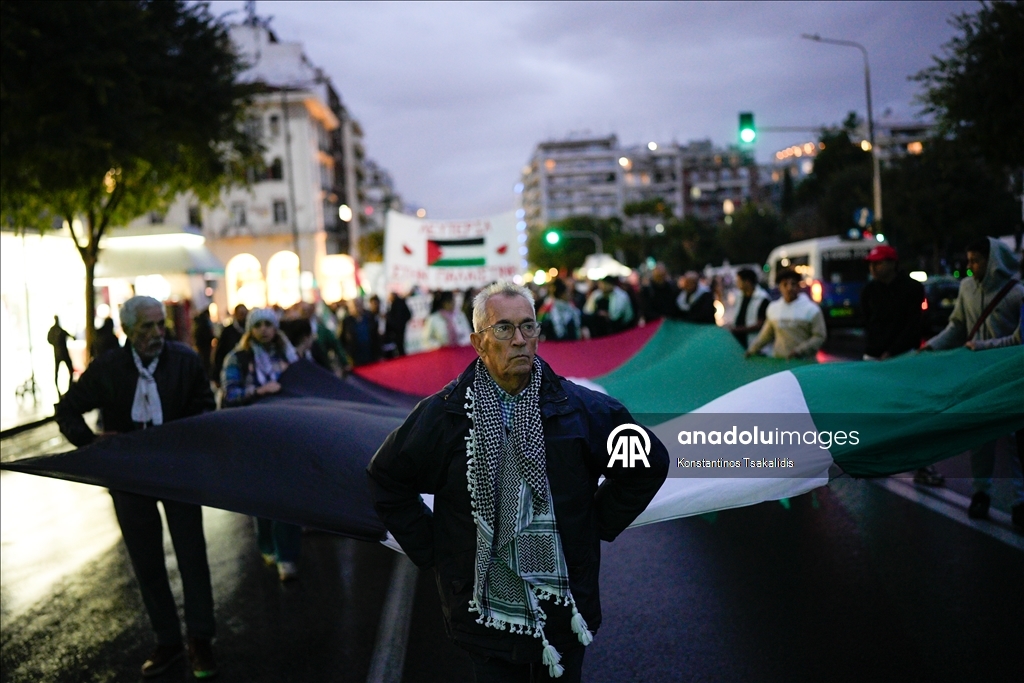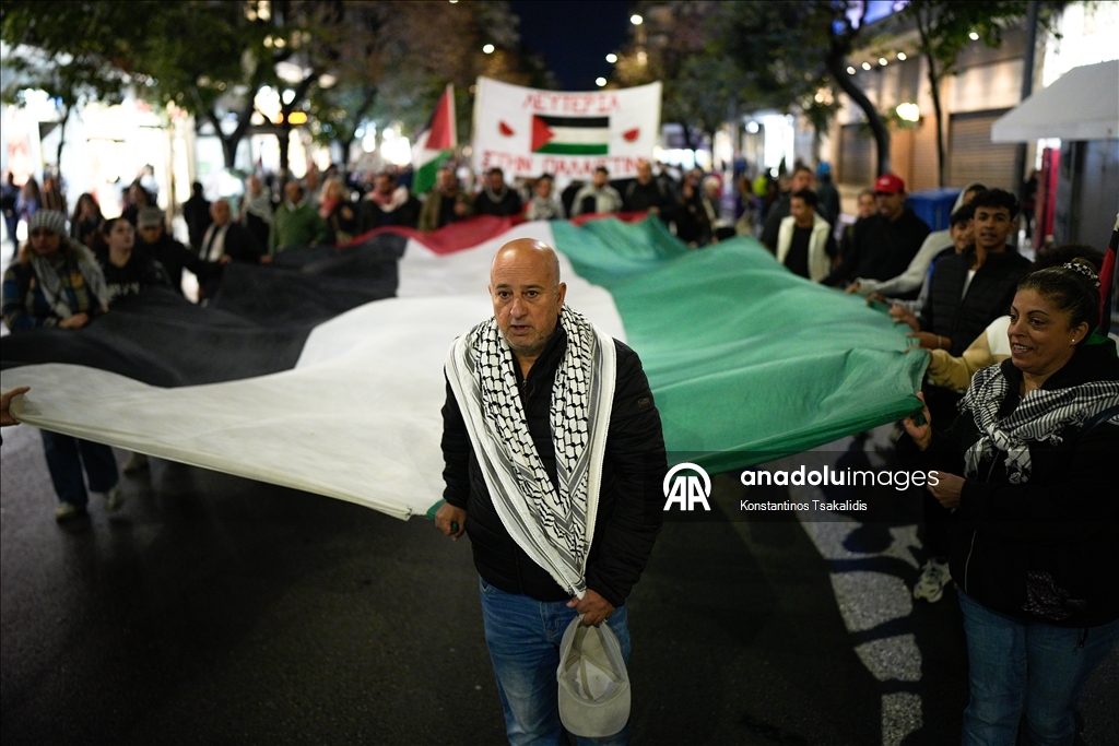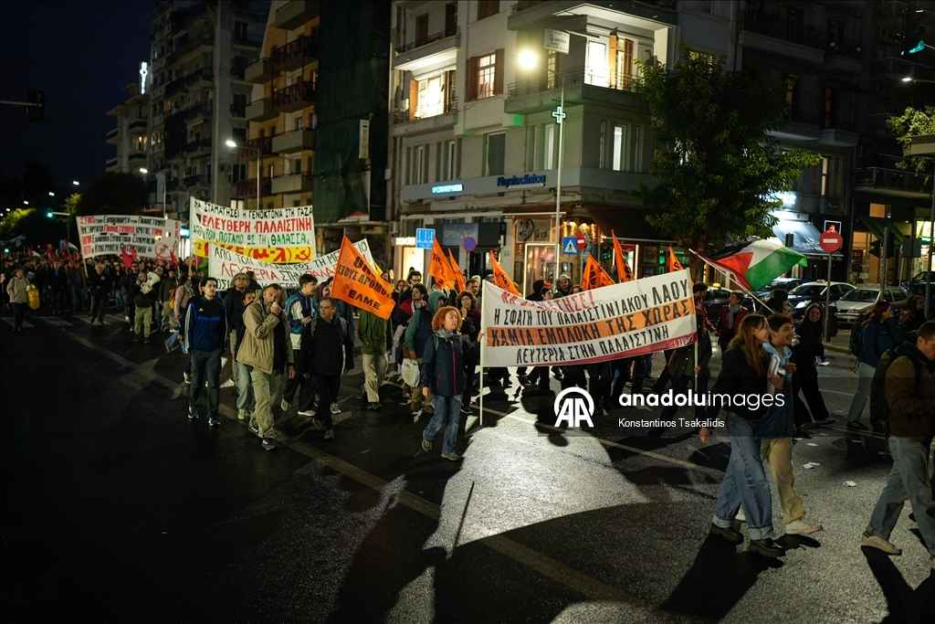 İsrail'in Global Sumud Filosunu durdurmasının ardından, Yunanistan'ın Selanik kentinde bir araya gelen Filistin yanlısı protestocular yürüyüş düzenledi. (Konstantinos Tsakalidis - Anadolu Ajansı)Konstantinos Tsakalidis