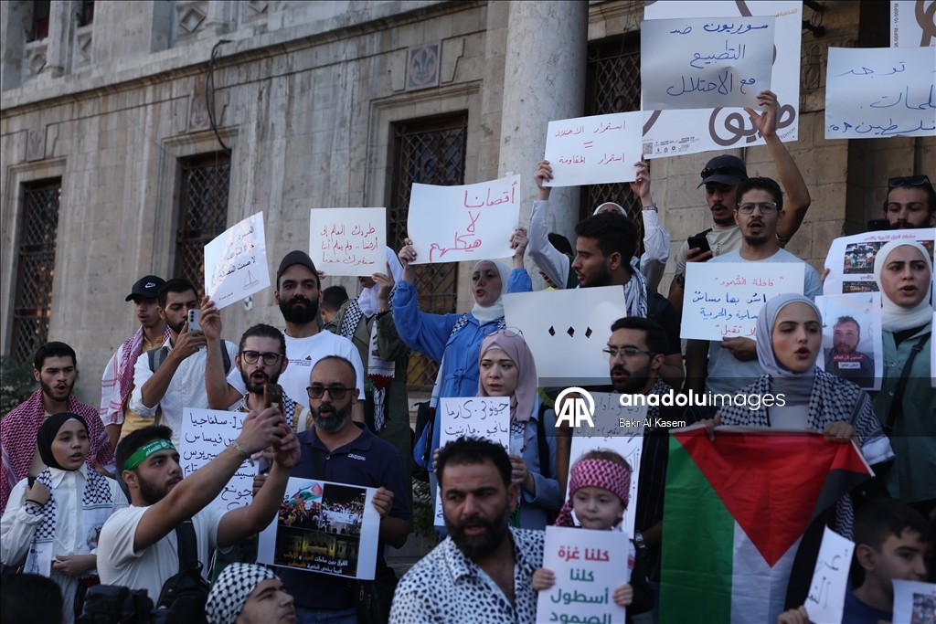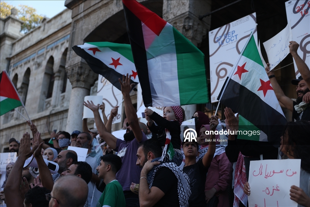 Suriye'nin başkenti Şam'da, Küresel Sumud Filosu'na destek amacıyla gösteri düzenlendi. Şam'daki Hicaz Meydanı'nda bir araya gelen göstericiler, "Aksa bizimdir", "İsrail ile normalleşmeye hayır", "Golan toprakları Suriye'nindir", "Hepimiz Gazze'yiz" ve "Hepimiz Sumud Filosu'yuz" şeklinde Arapça, İbranice ve İngilizce yazılı dövizler taşıdı. Göstericiler, sürgündeki Filistinlilerin dayanışmasını vurgulayan ve Gazze'ye destek veren sloganlar attı. (Bakr Al Kasem - Anadolu Ajansı)Bakr Al Kasem